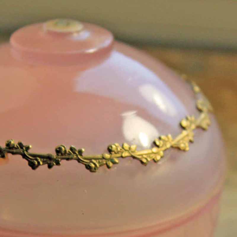 金のガーランドがかわいいピンクのガラスの容器。クリームなどを入れていたものだと思います。古いものなのでふちに小さな欠けがありますが、ふたをするとわかりません。