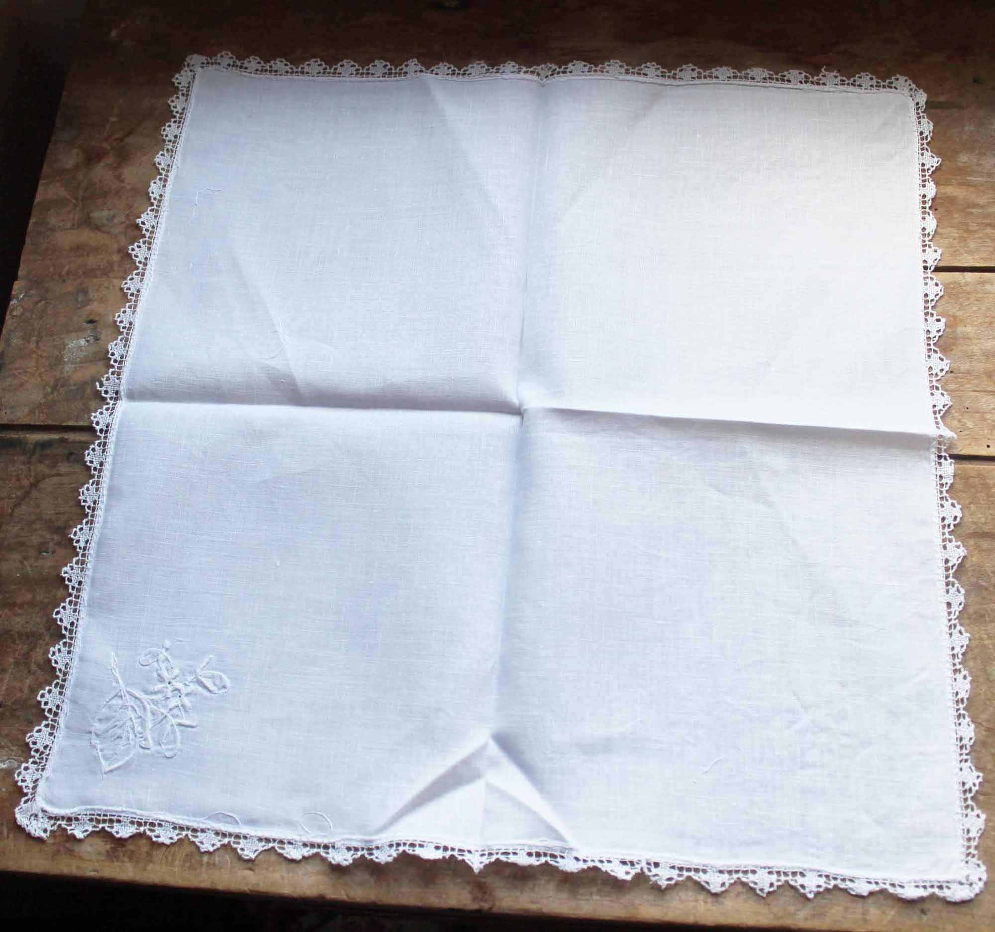 100年ぐらい前の古いハンカチ。 コットンリネン製で、手刺繍、ハンドメイドのレースが使われています。古いものですが、使われた形跡のないきれいなものです。