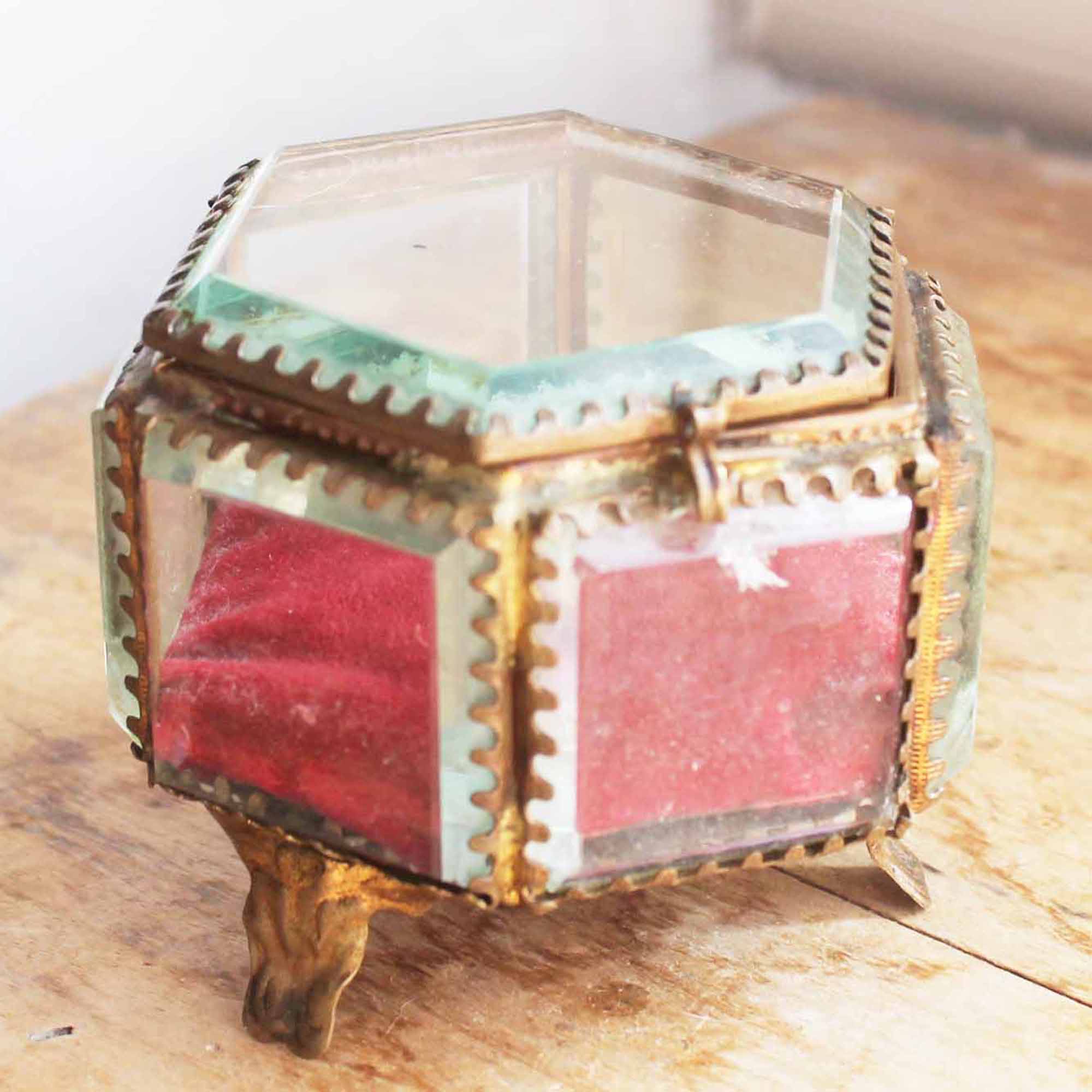 20世紀初期の古い宝石箱。古いものなので全体的に歪んでいます。またガラスの淵1か所に小さなダメージがあります。