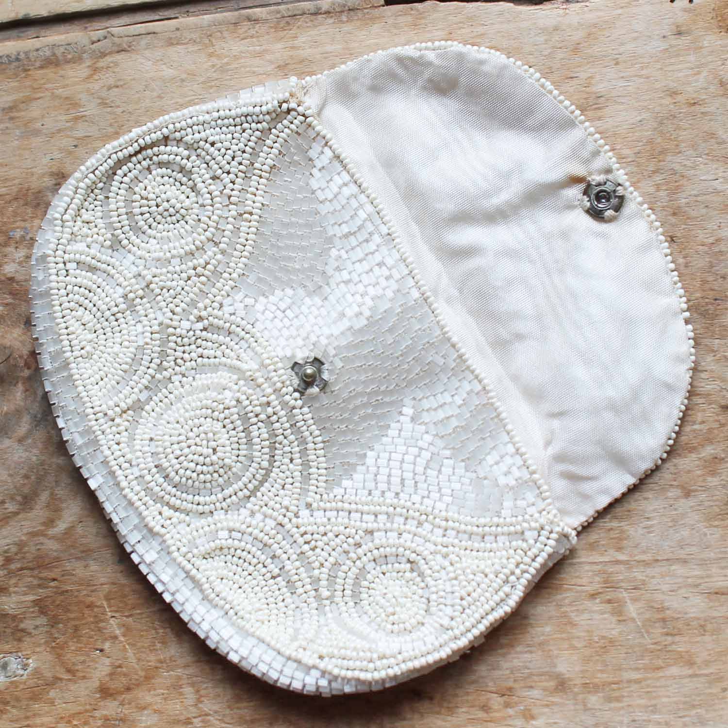 100年ぐらい前の古いガラスビーズ製のパース。ドレスのベルトに取り付けるタイプのものです。古いものなので多少の汚れが内側にありますが、表側はきれいです。