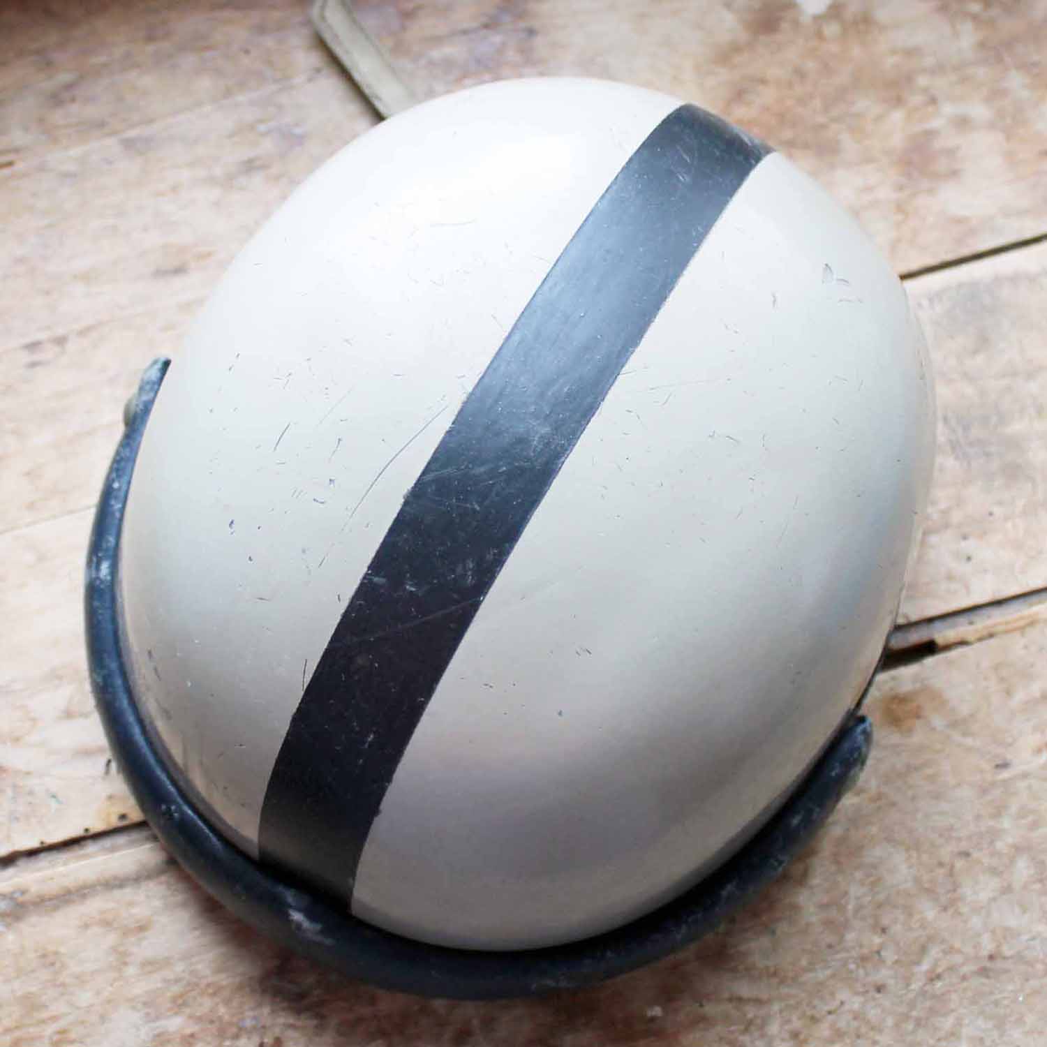 古いフランス Sable社製のヘルメット。皮部分は合成革です。古いものなので傷、汚れなどがあります。当時と法律が違うと思いますので、実用はできないと思います。