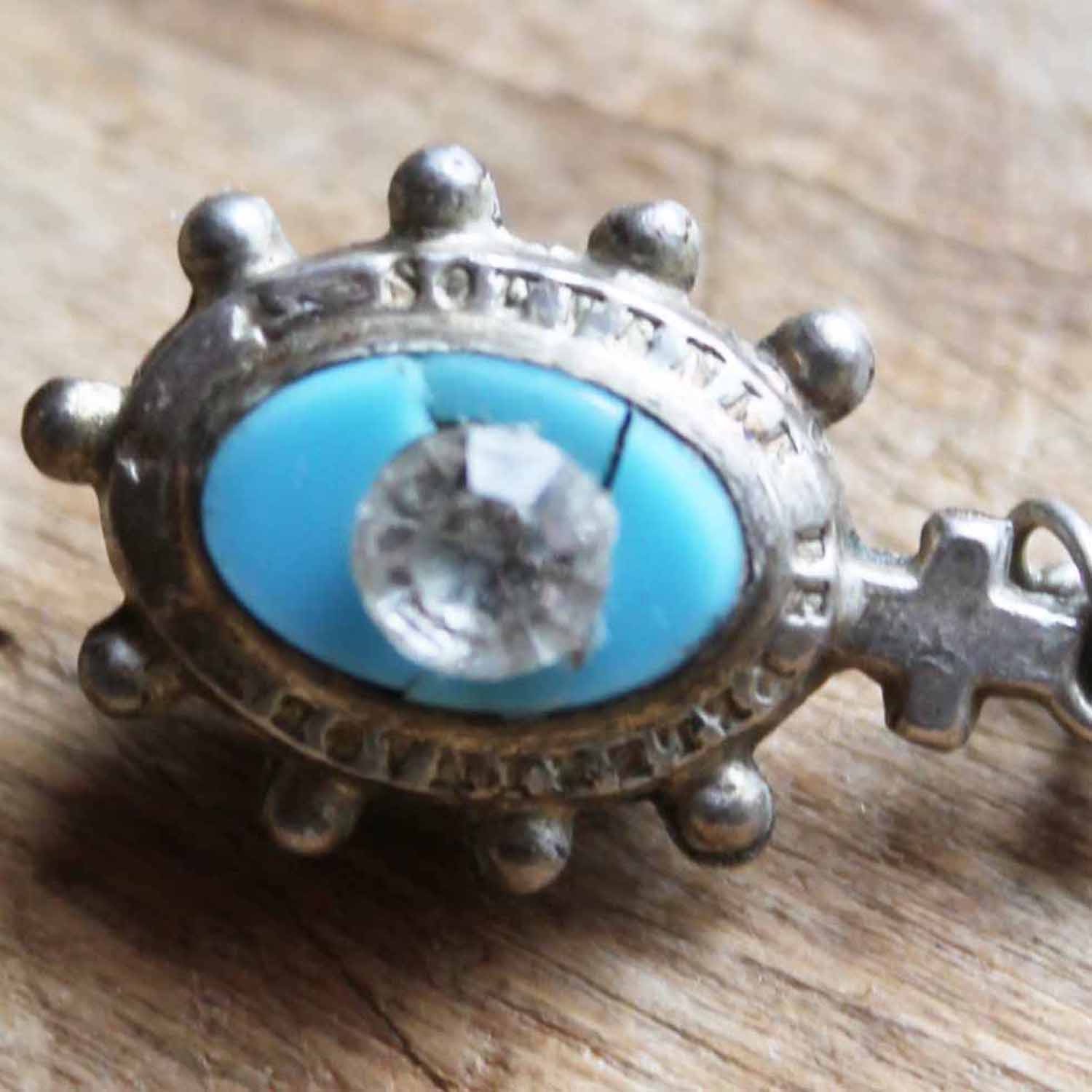 古い十字架がモチーフのネックレス。中央の楕円部分の淵に文字が刻印されていますが、つぶれていてよく読めません。楕円の上に十字架がついています。チェーンは修繕されています。ペーストグラスがついている部分に多少のダメージがあります。
