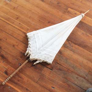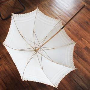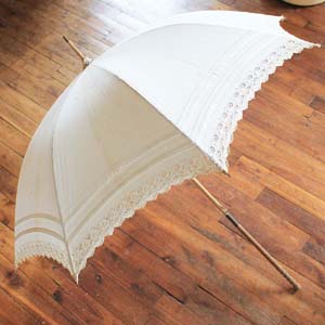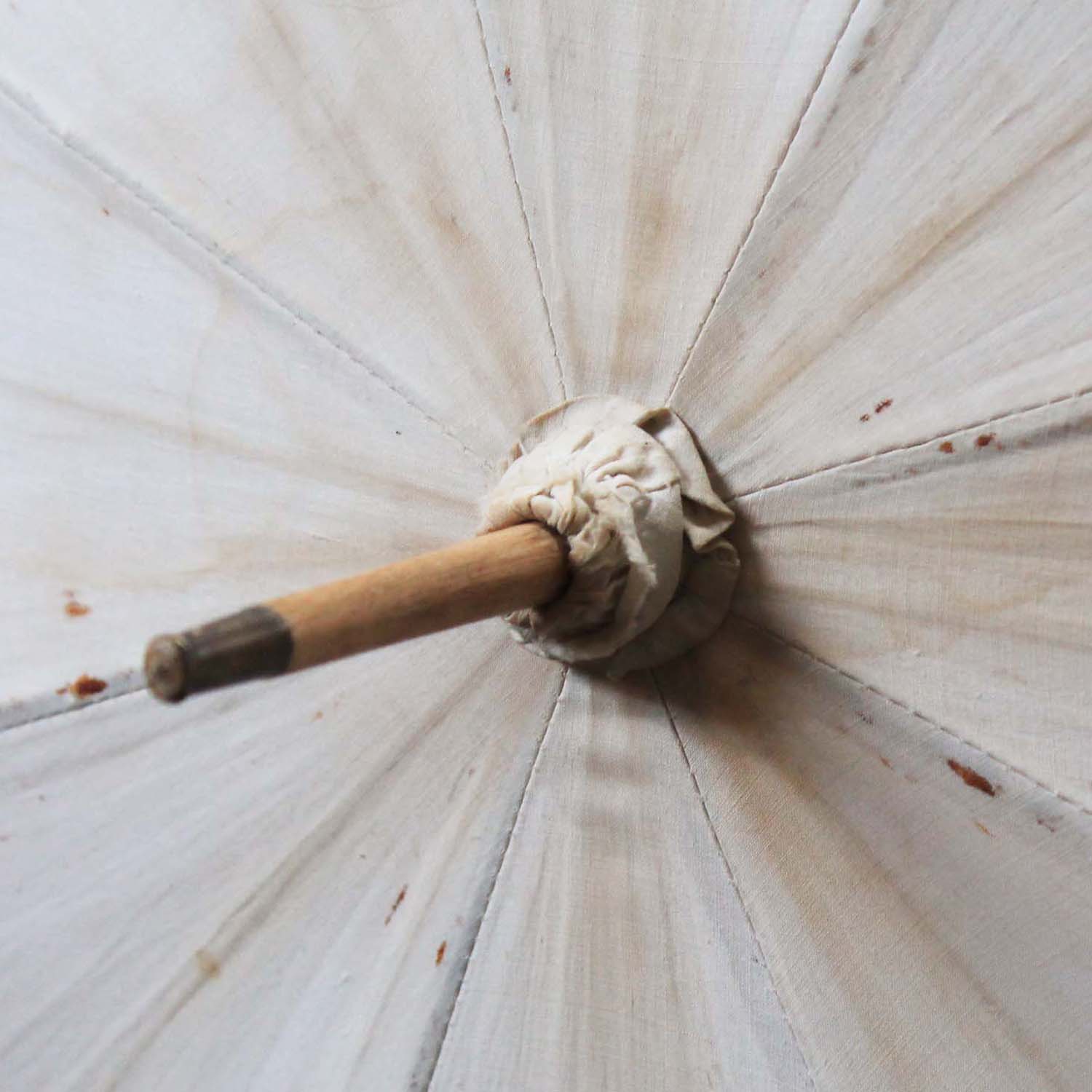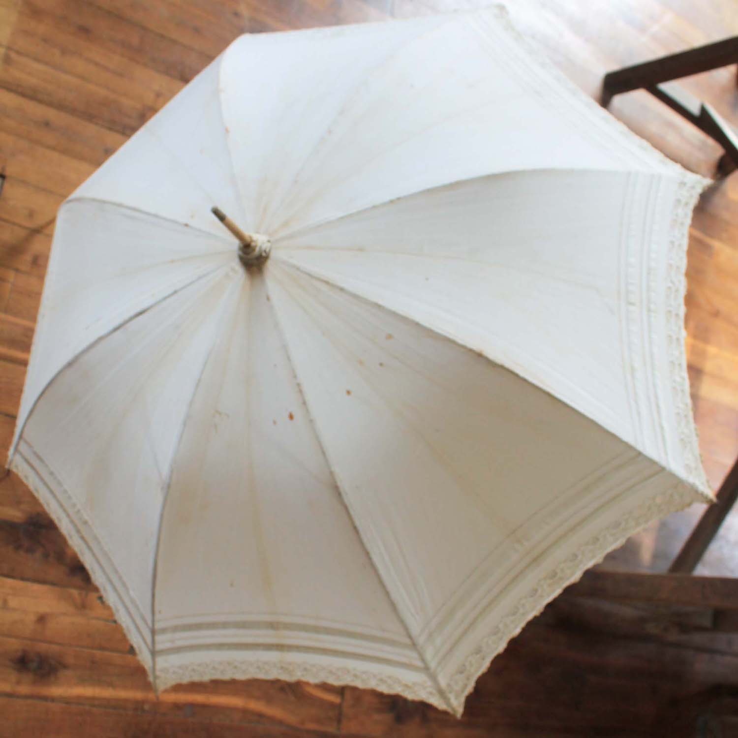 100年ぐらい前の古い日傘。コットン製で淵に手刺のイギリス刺繍が施されています。古いものなので汚れ、さび、修繕があります。持ち手はねじで2つに分かれるようになっています。