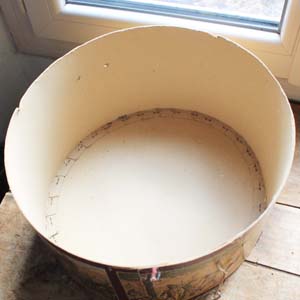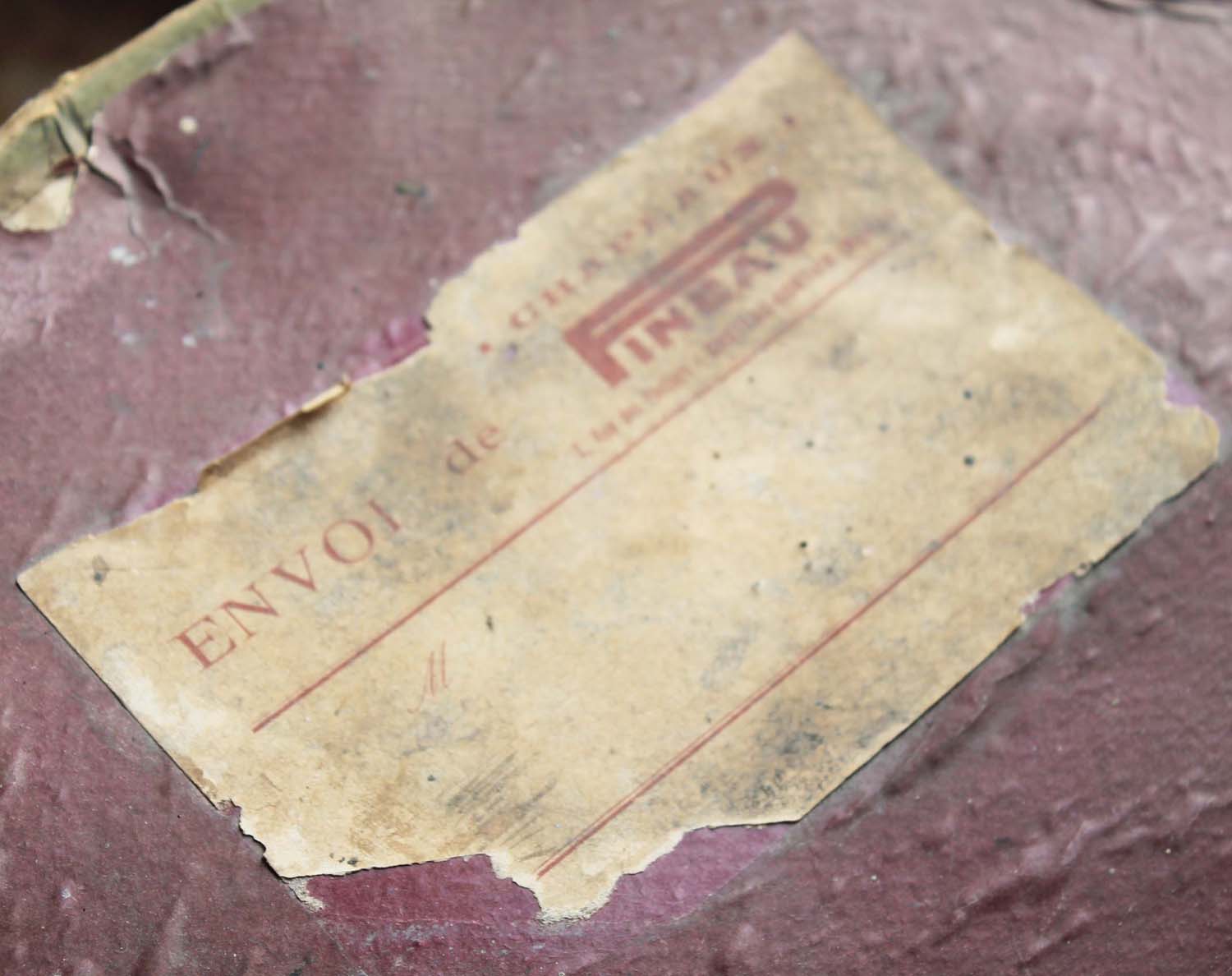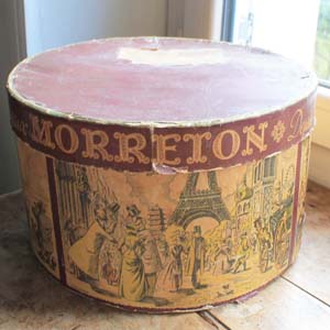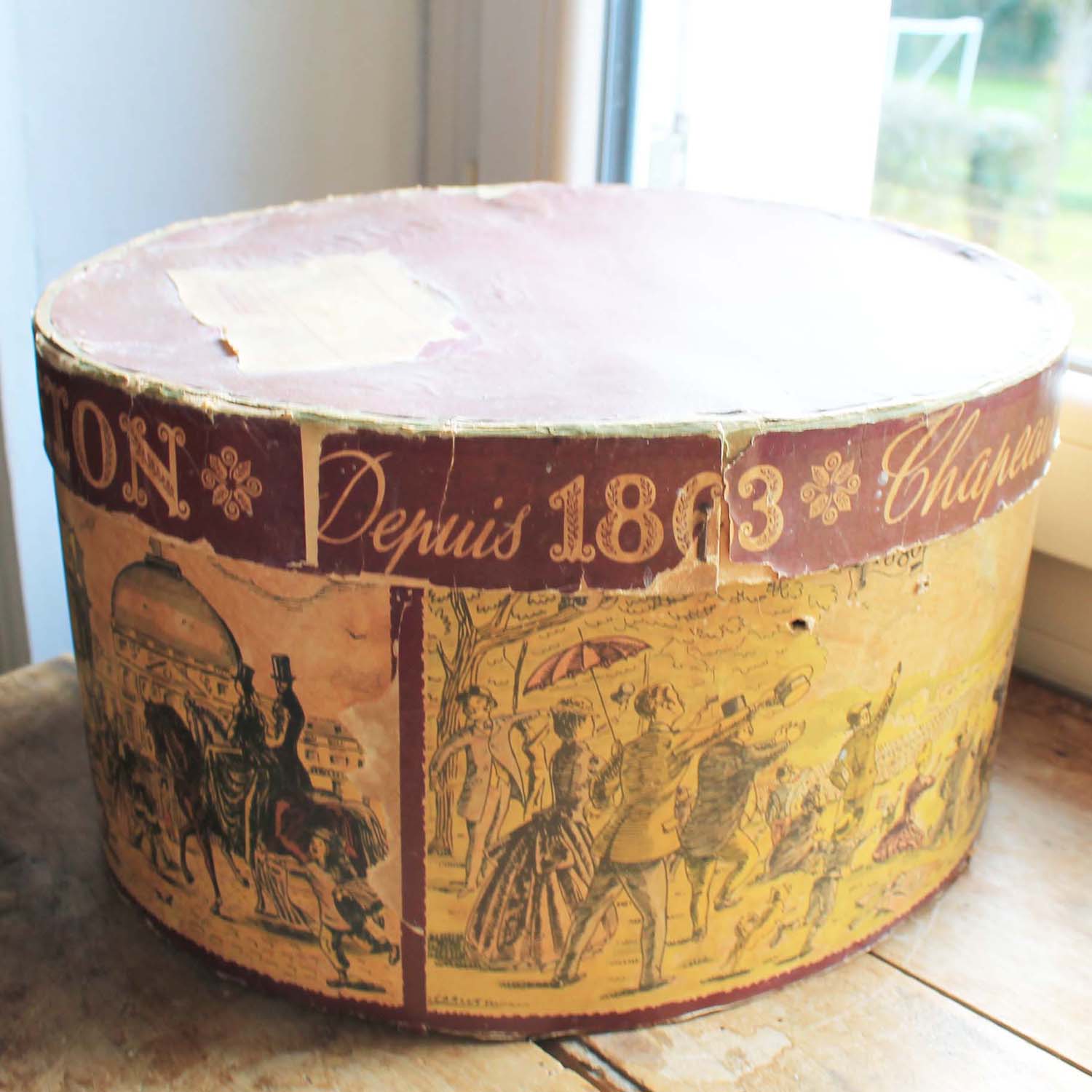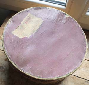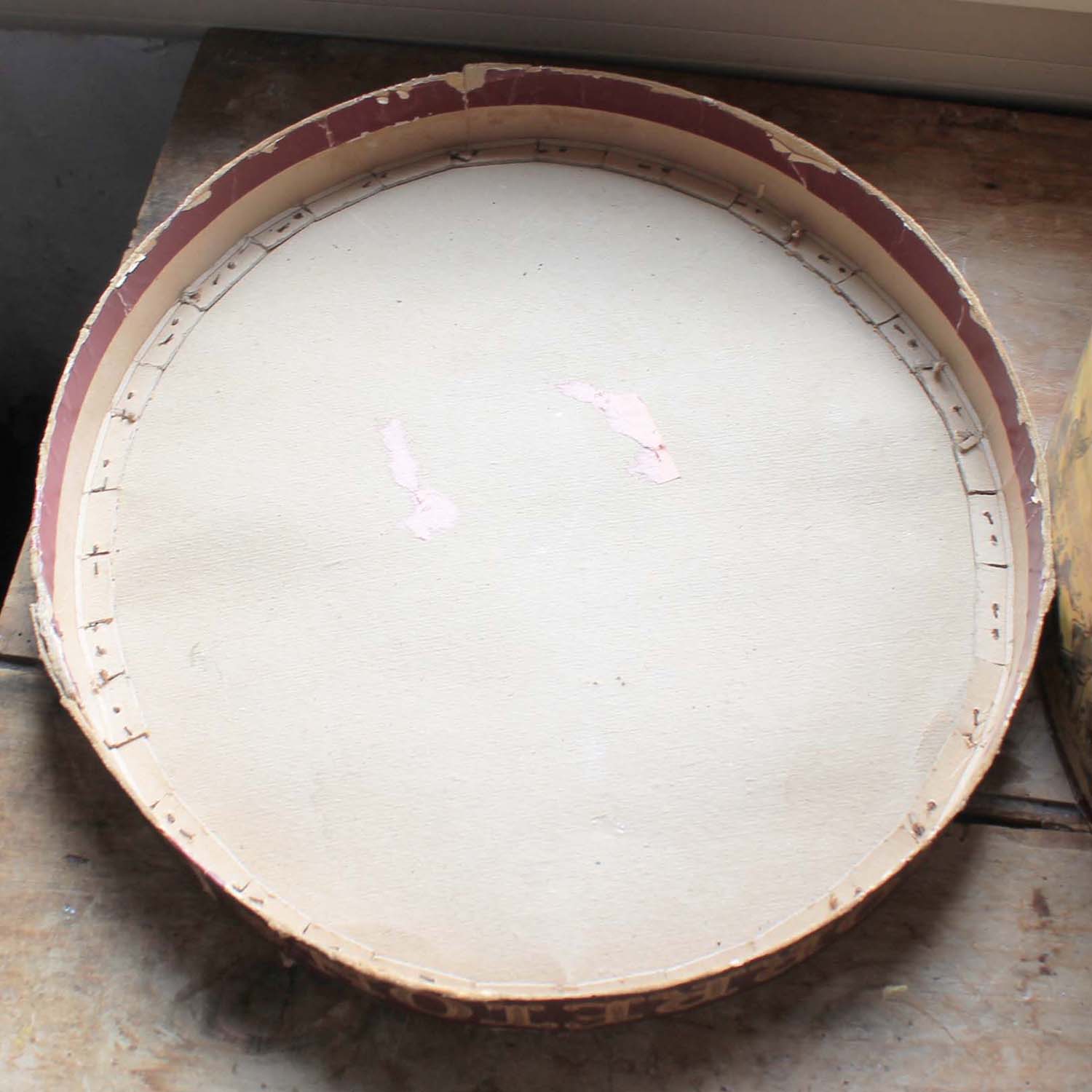 100年ぐらい前の古いハットボックス。年代は1900~1920年の間になります。古いものなので傷、汚れ、紙の切れがあります。
