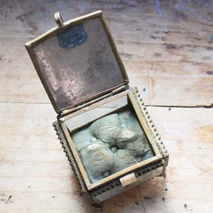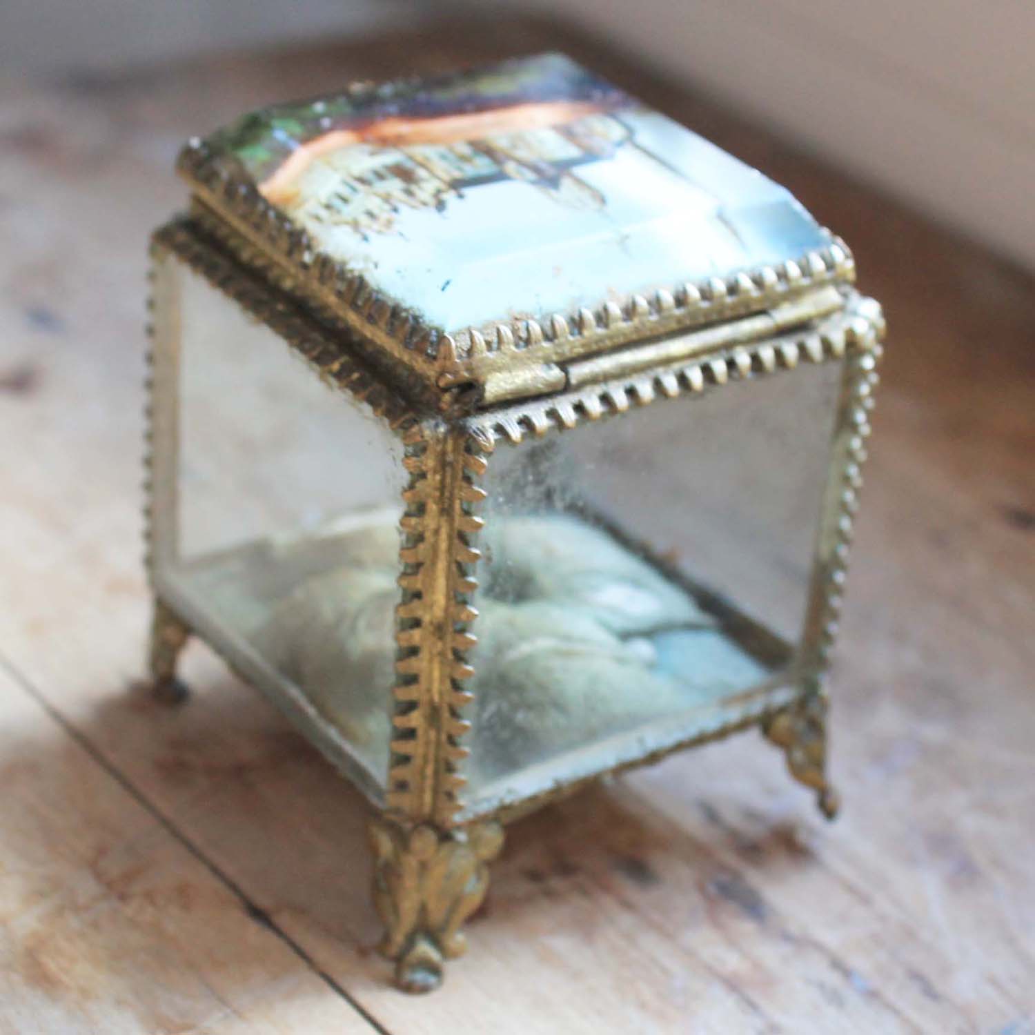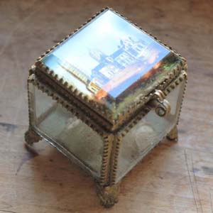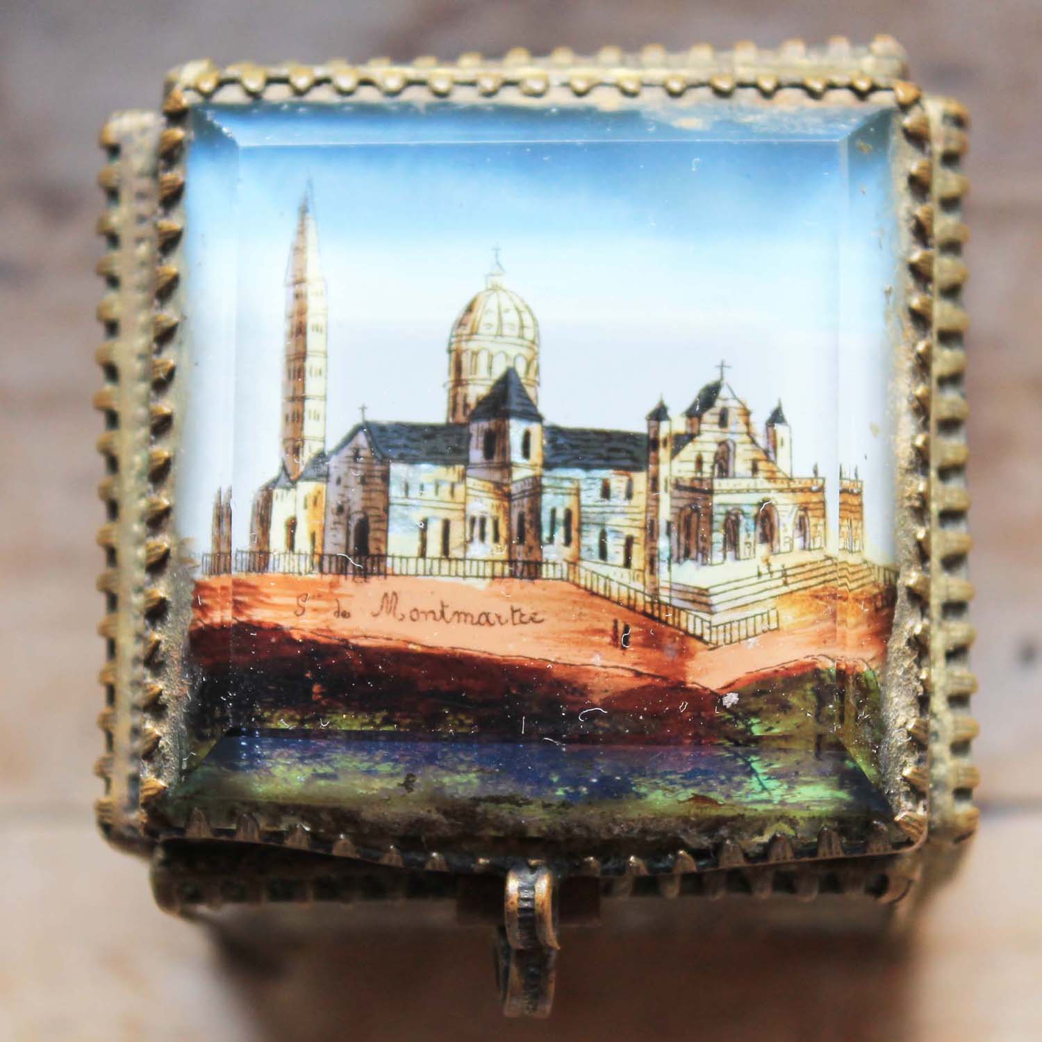 100年ぐらい前の古い小さな宝石箱。パリ モンマルトルのサクレクールがモチーフになっています。ふるいものなので クッション部分に多少の切れがありますが、ガラスにダメージはありません。