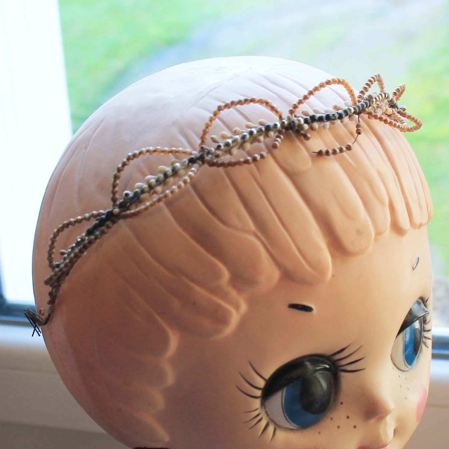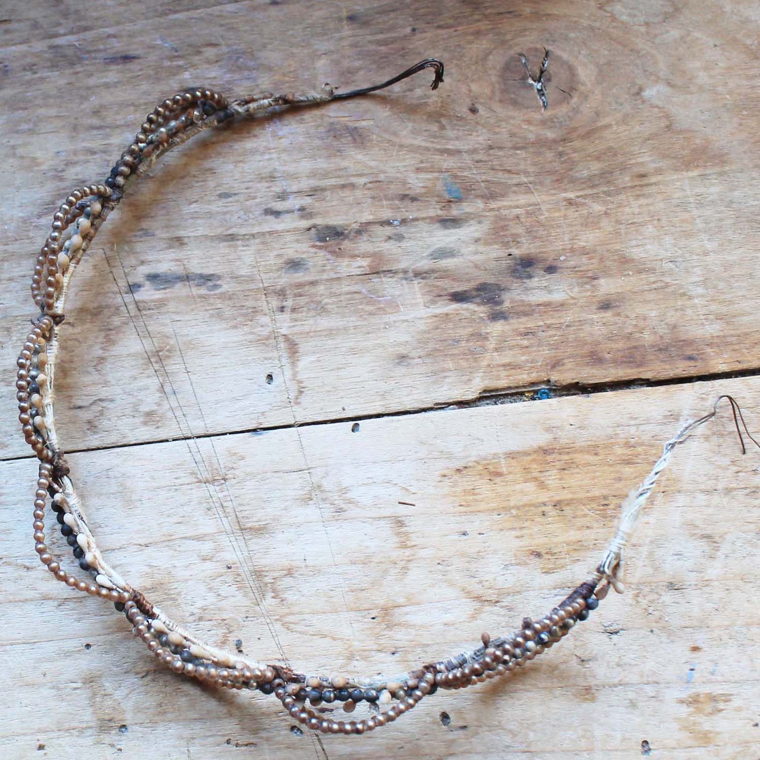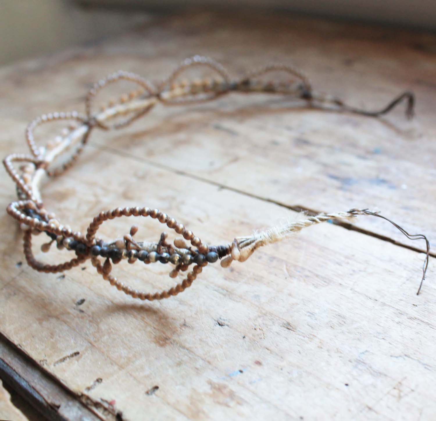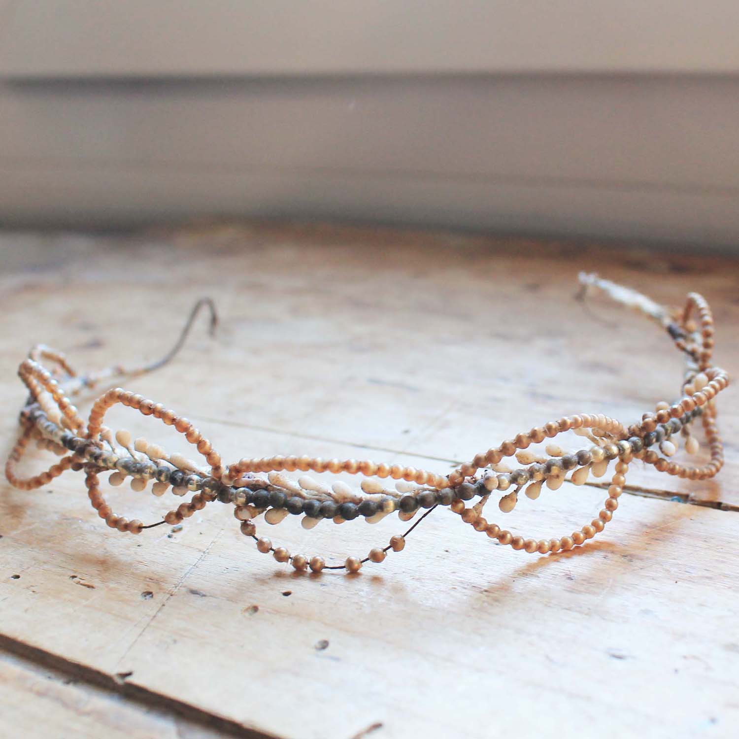 結婚式で使った100年の古いワックスフラワーのティアラ。 細いタイプで一部ワックスで作られたビーズも使われています。古いものなので傷、汚れ、多少ダメージがあるところがあります。。