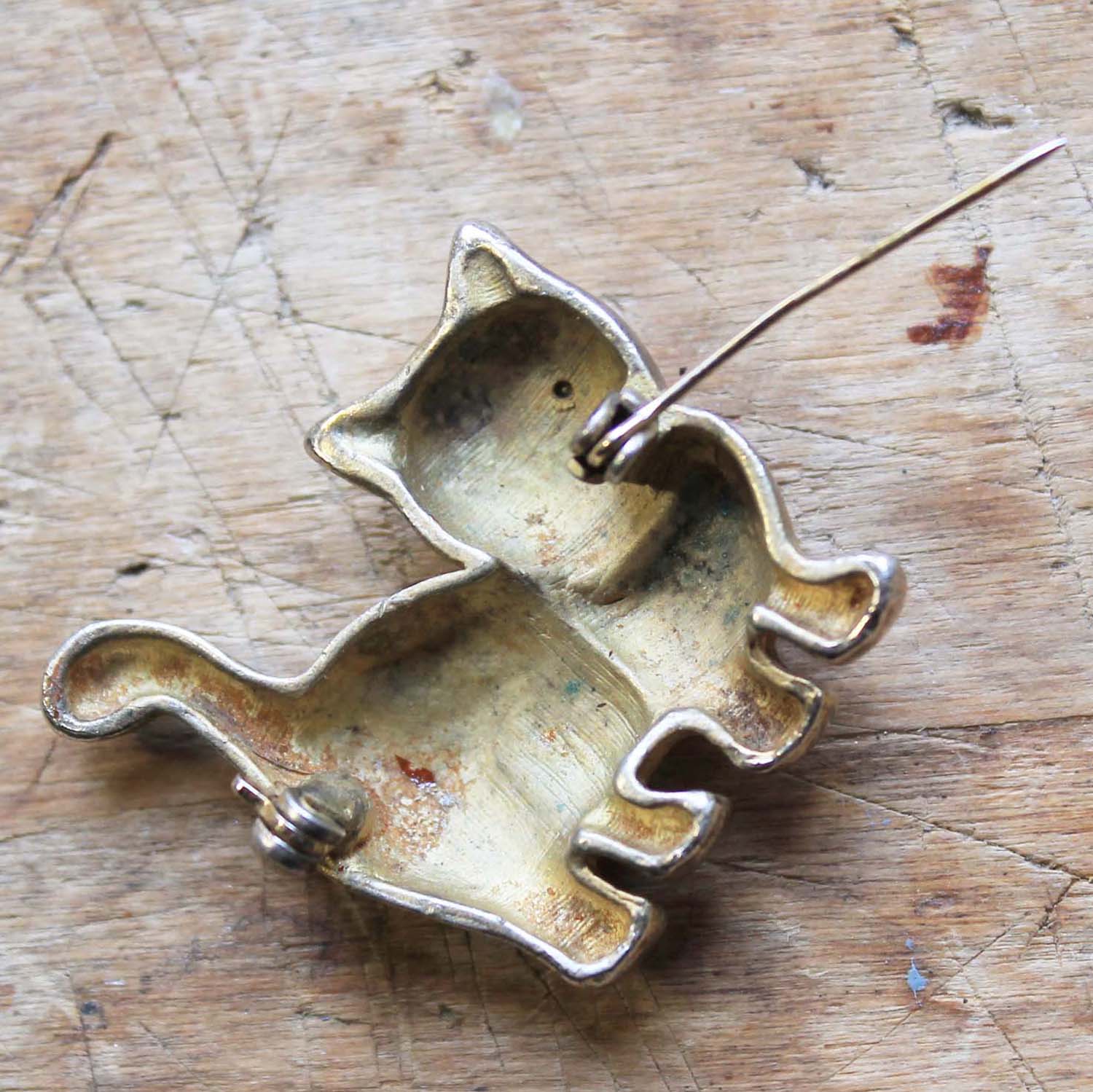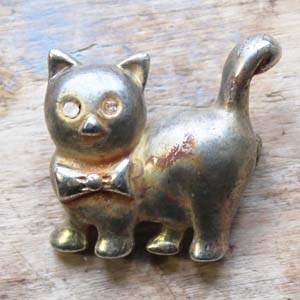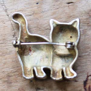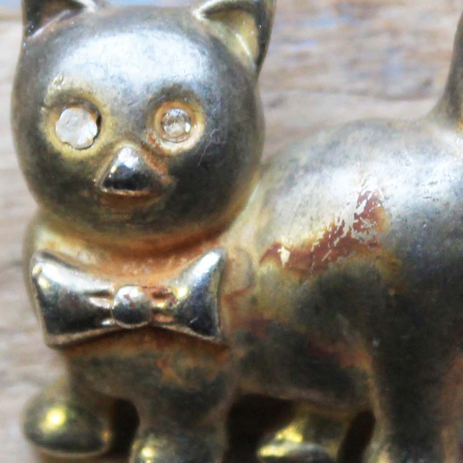 かわいい猫のモチーフのブローチ。目の部分はペーストグラスが使われています。 古いものなので多少汚れがあります。
