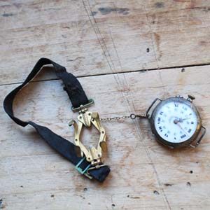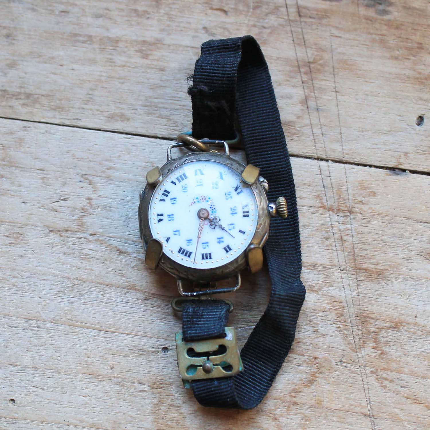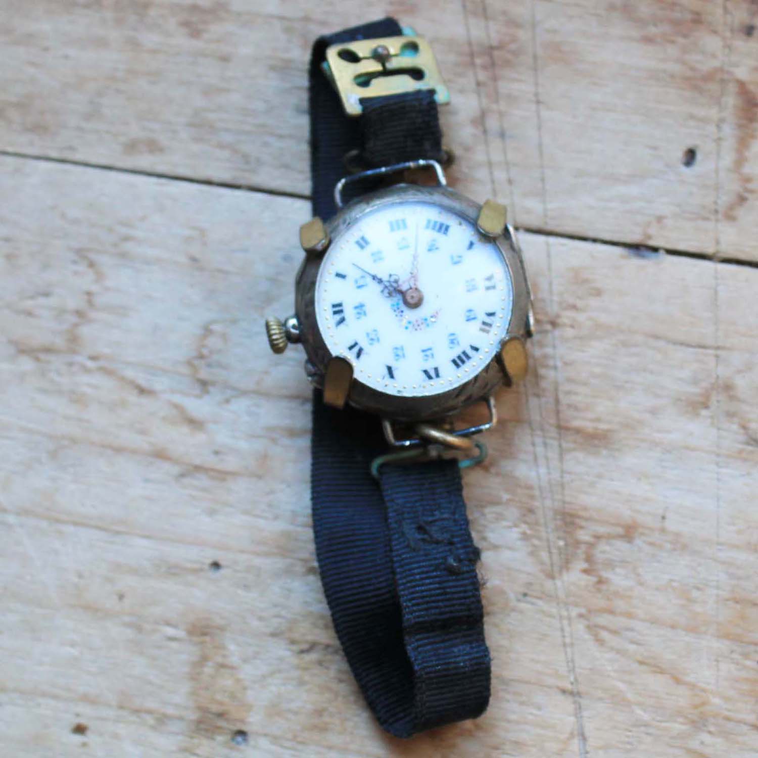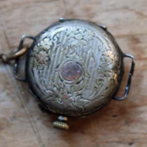 100年以上前の古い女性用腕時計。 時計部分の作りは懐中時計で、腕時計にするベルトがついています。時計のFaceはホーロー製です。 古いものなので時計は動いていません。