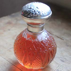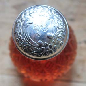 古いオーデコロン。 キャップにイニシャルHが刻まれています。中身もまだ入っていて匂いもあります。本体はガラス、ふたはプラスティックです。