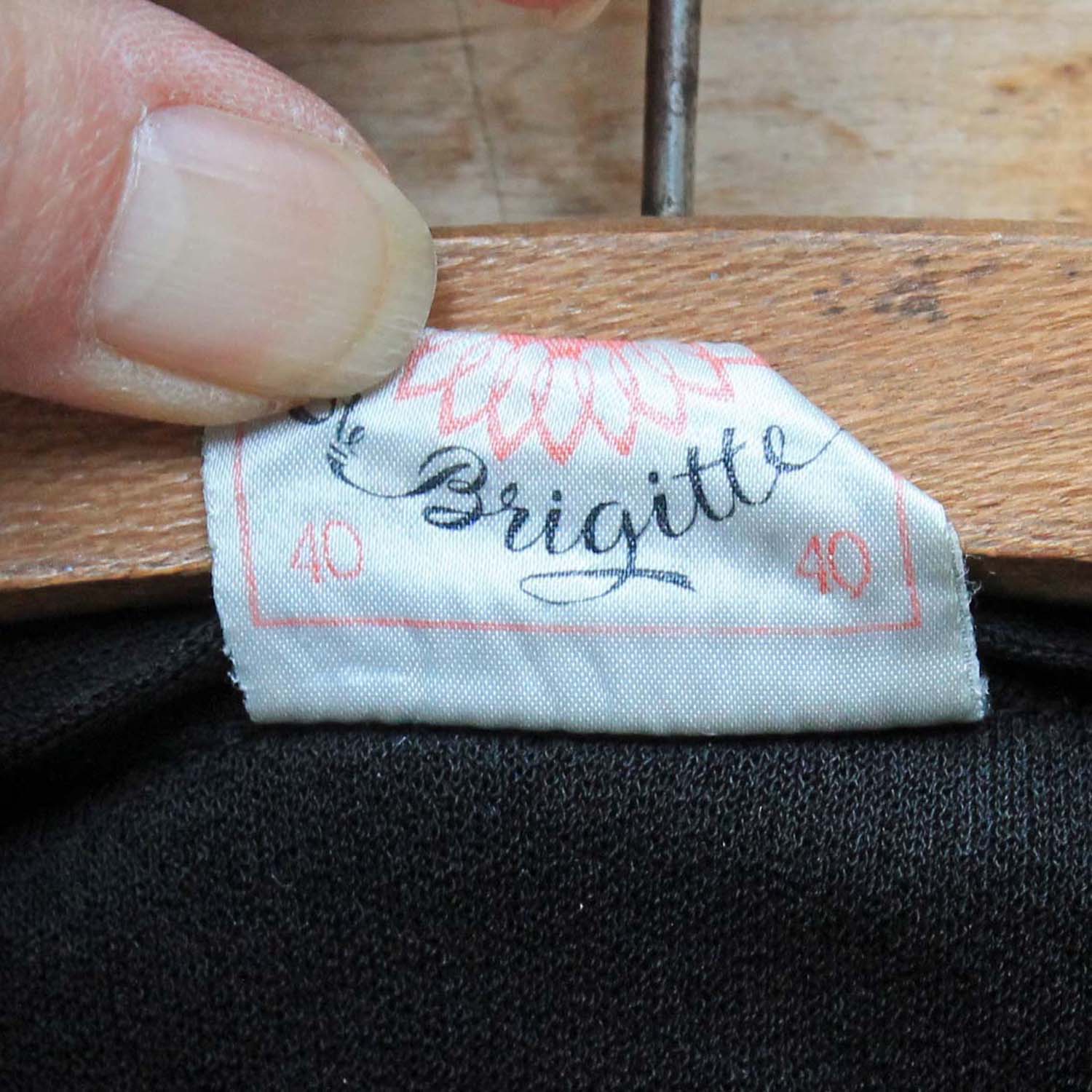 古いワンピース。 1940年代ぐらいのものではないかと思います。タグ付き。 古いものなのでスカートの裾にダメージが入っています。 スカートは長いので、裾をお好みに切って修繕したら着用も可能だと思います。ボタンは貝ボタンです。
