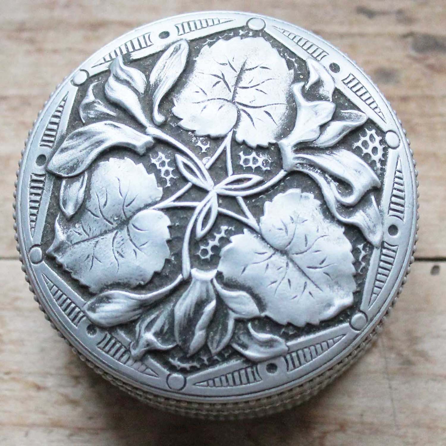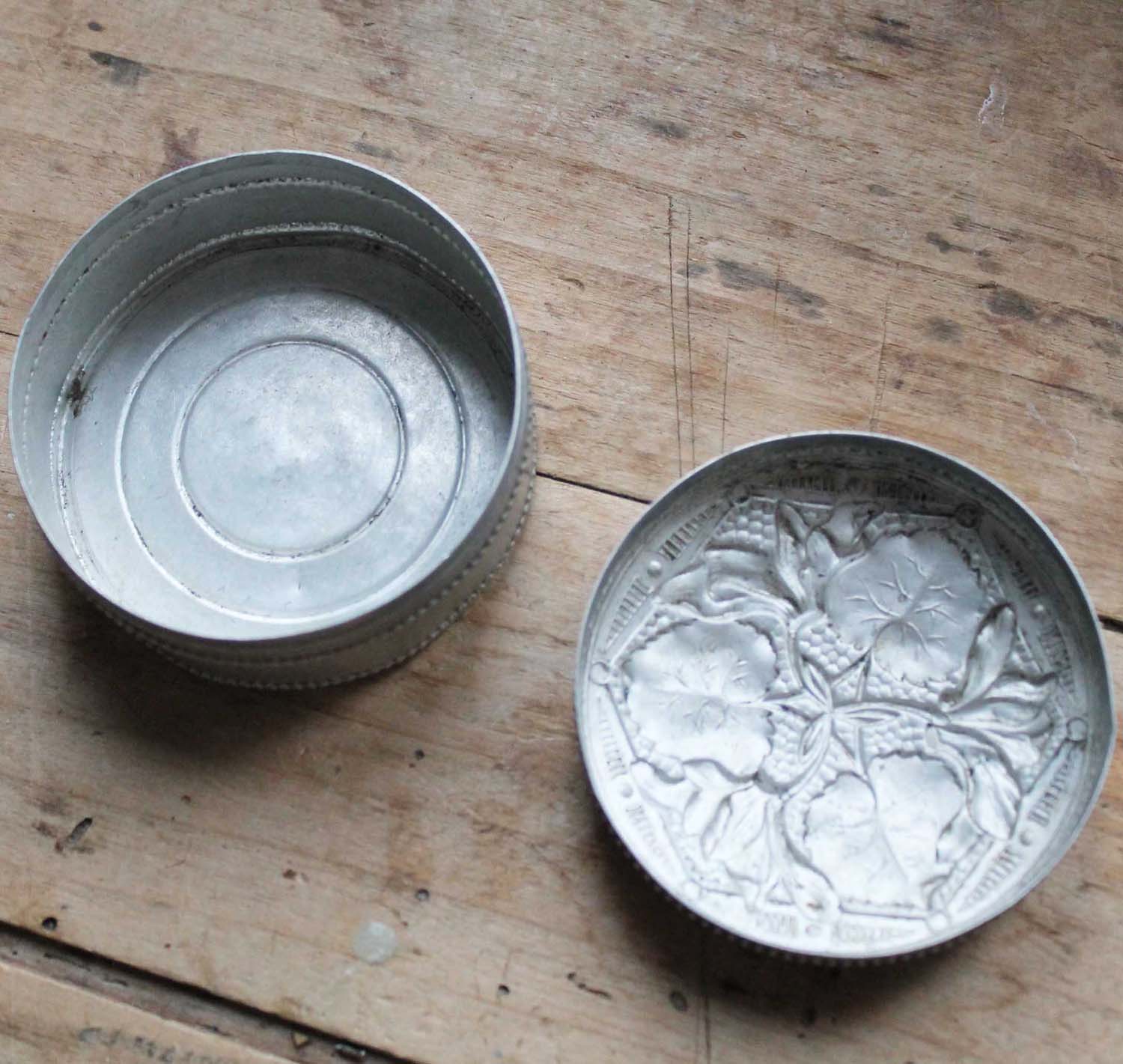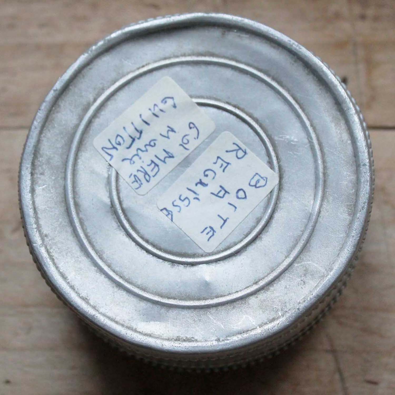 100年ぐらい前の古いアルミ製の箱。裏に手書きでリコリシュと書かれたシールが貼られています。古いものなので多少の傷、汚れがあります。