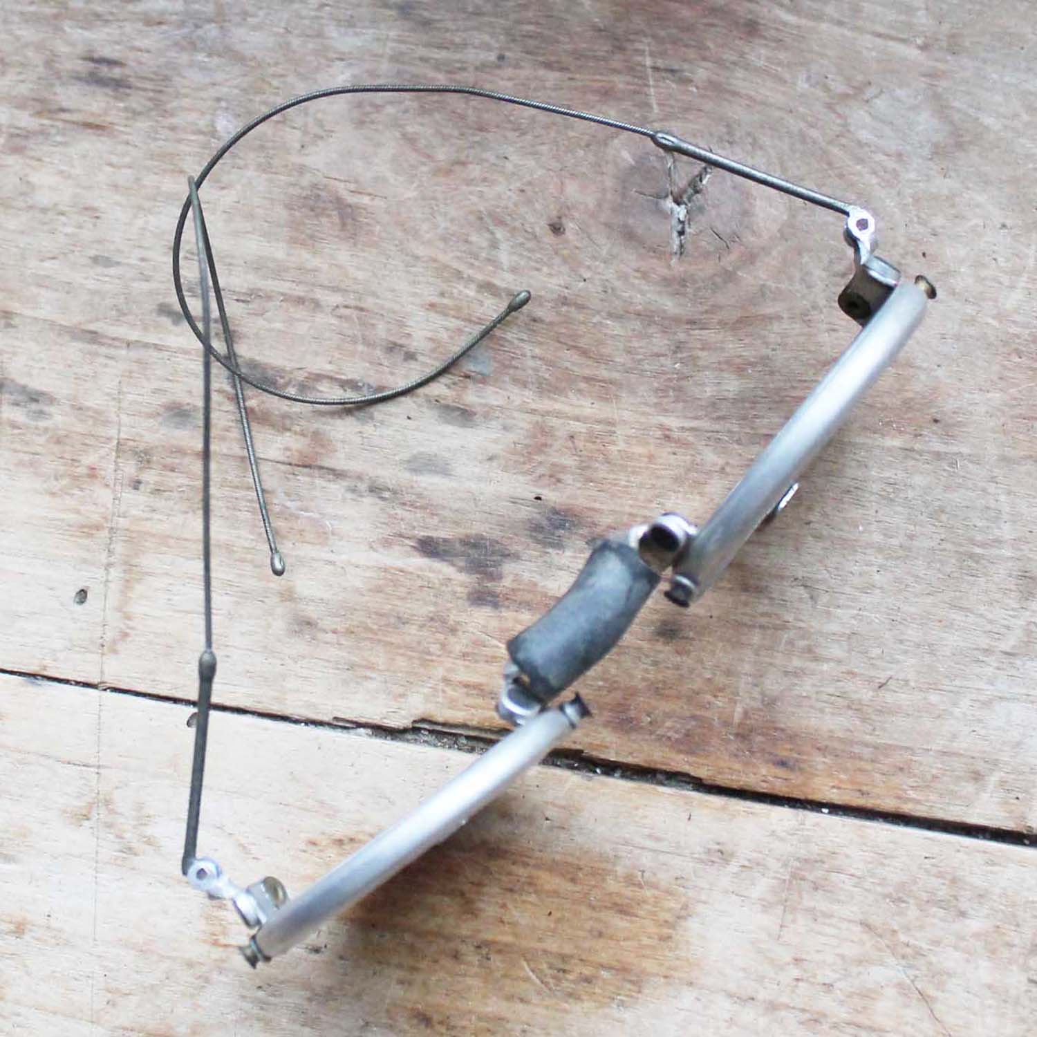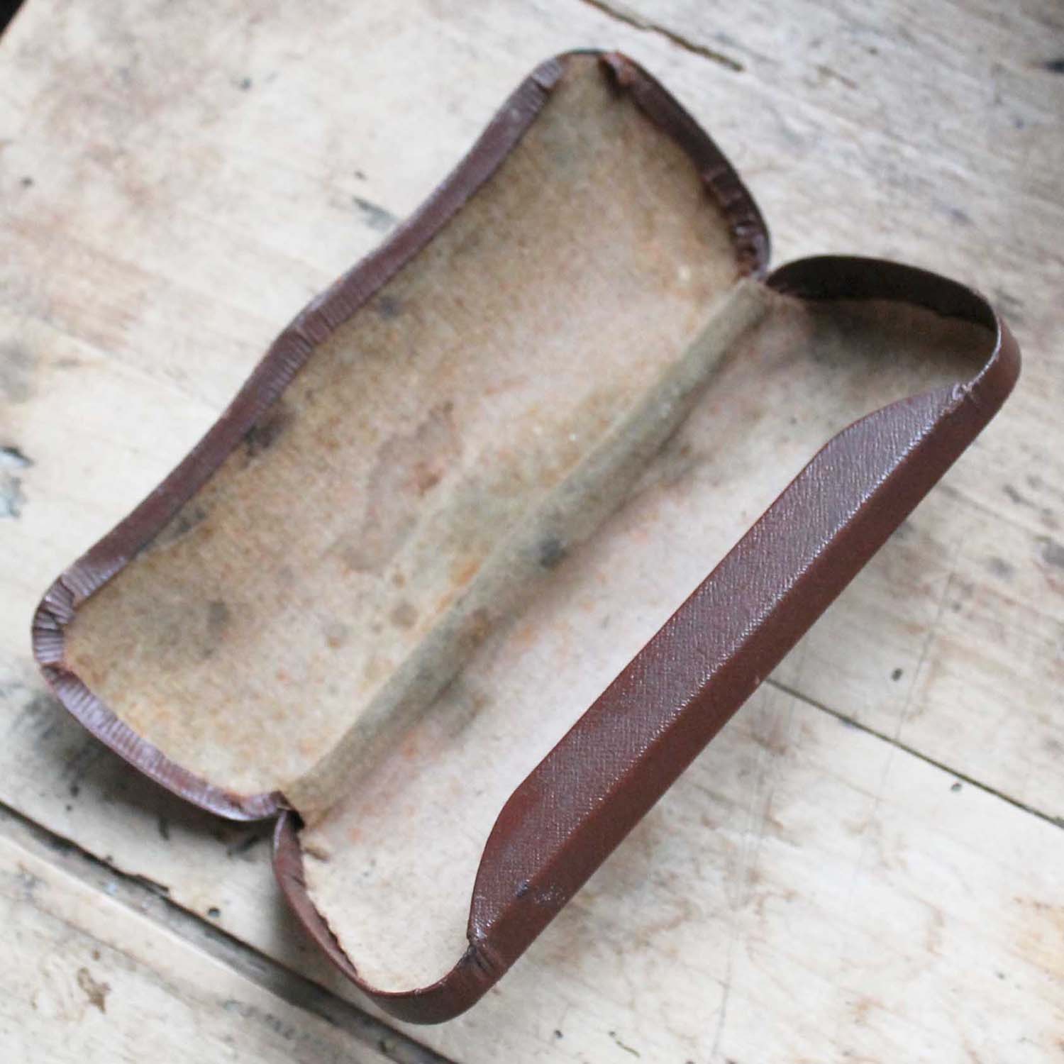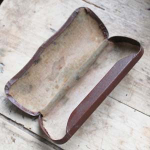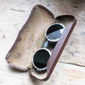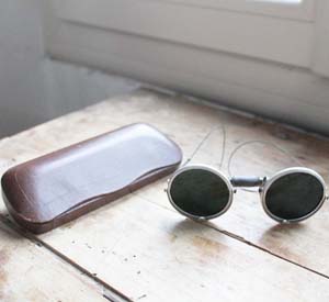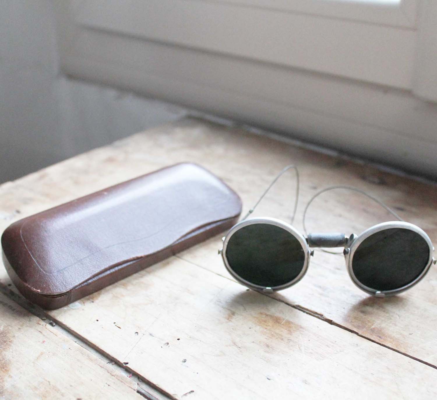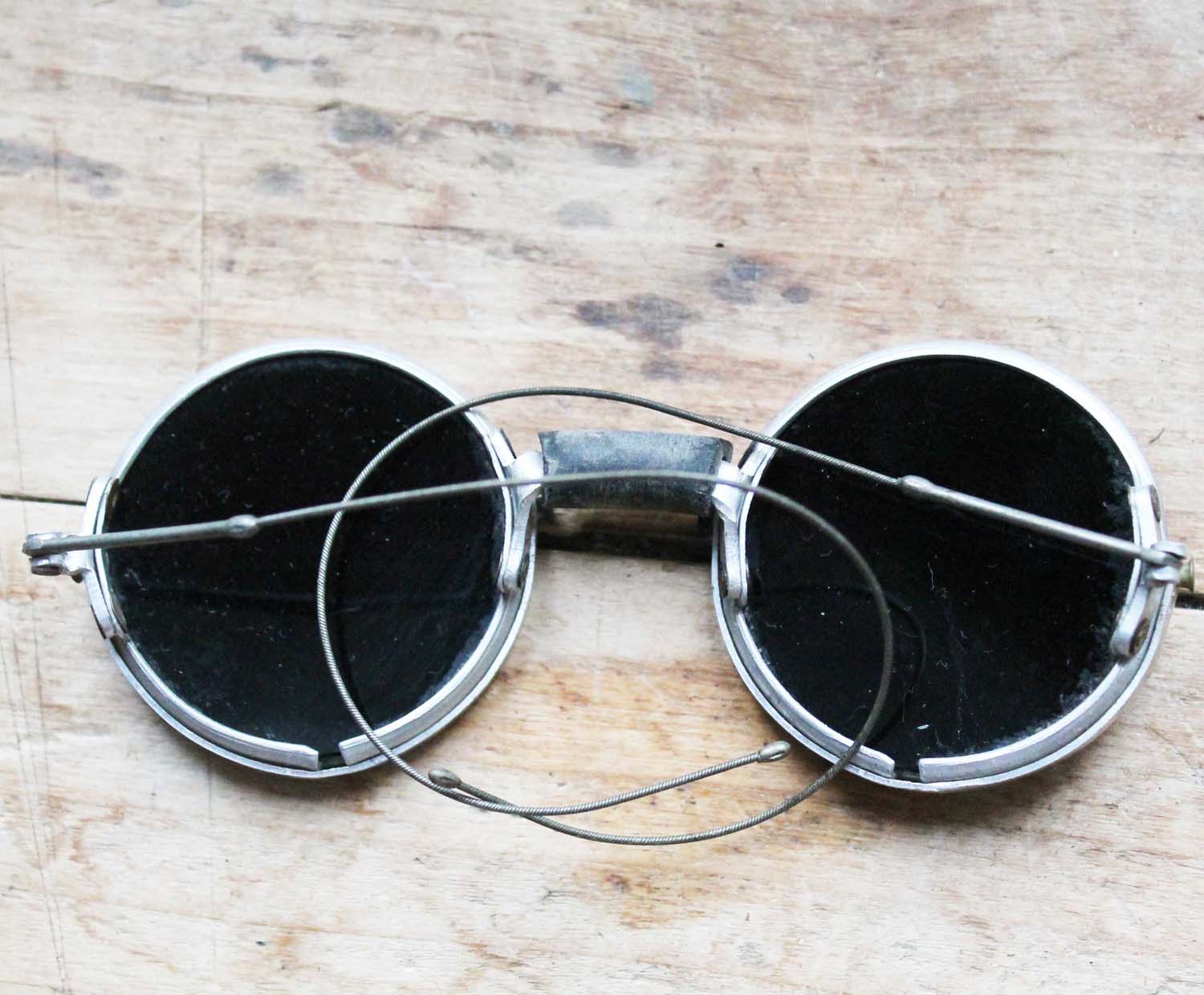 100年ぐらい前の古いサングラス。 枠はアルミ製でガラスは簡単に交換できるようになっています。 乗馬、自動車、バイクなどに乗る方用に作られていてつるが取れにくくなっています。古い眼鏡ケース(金属製)付です。