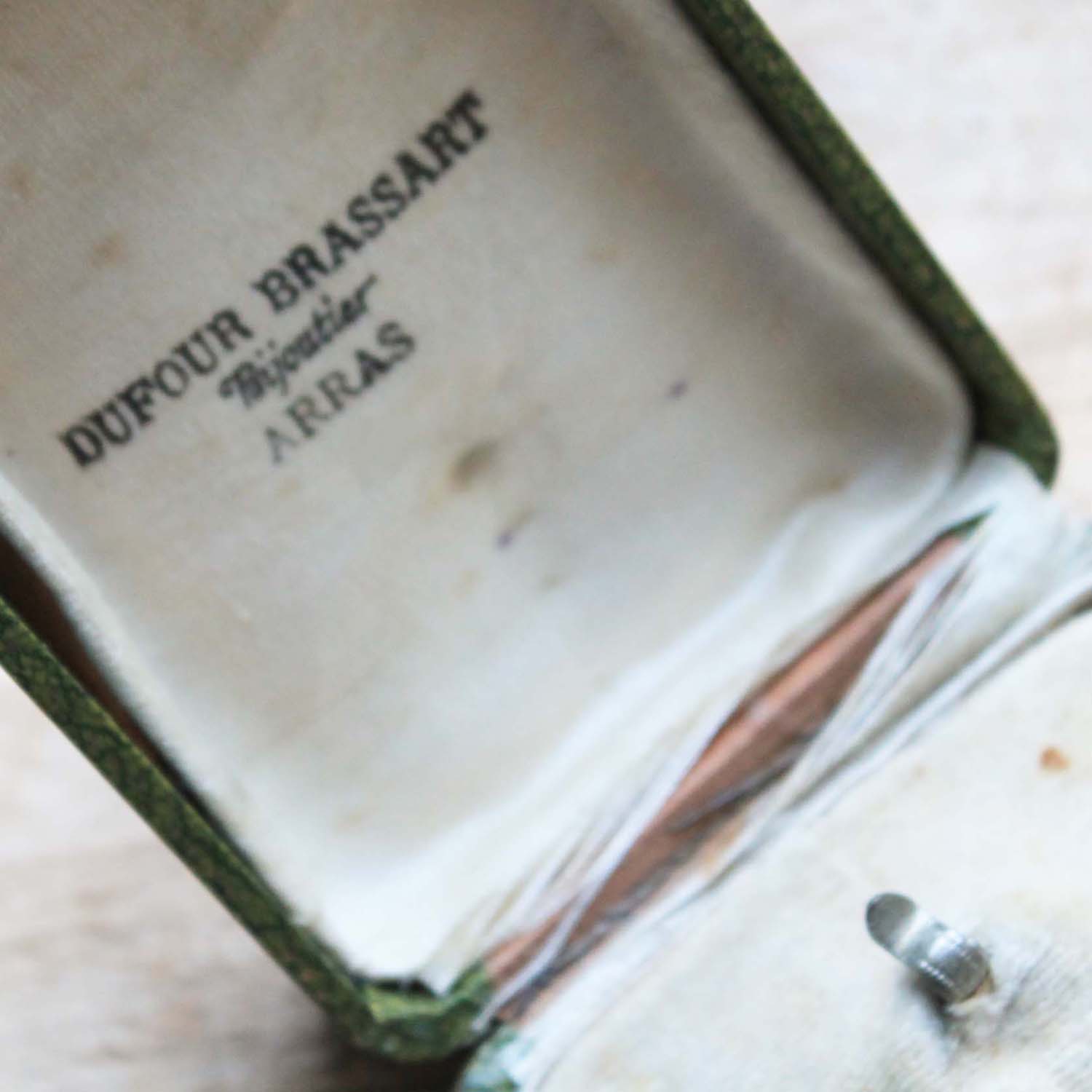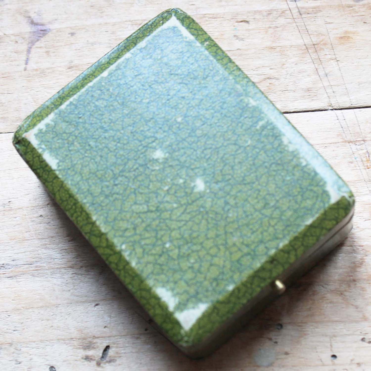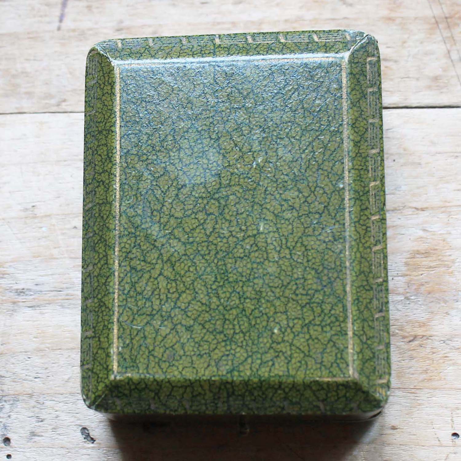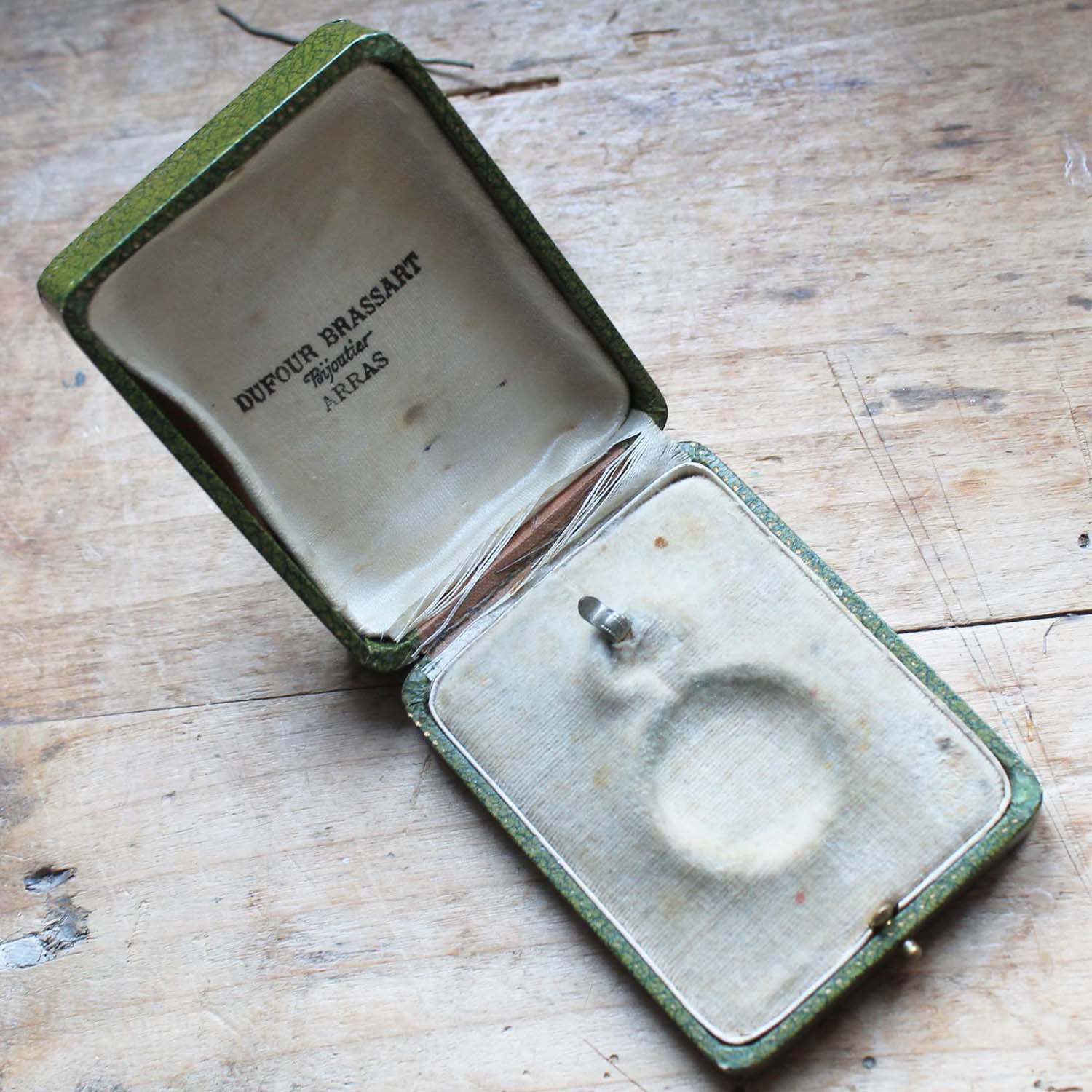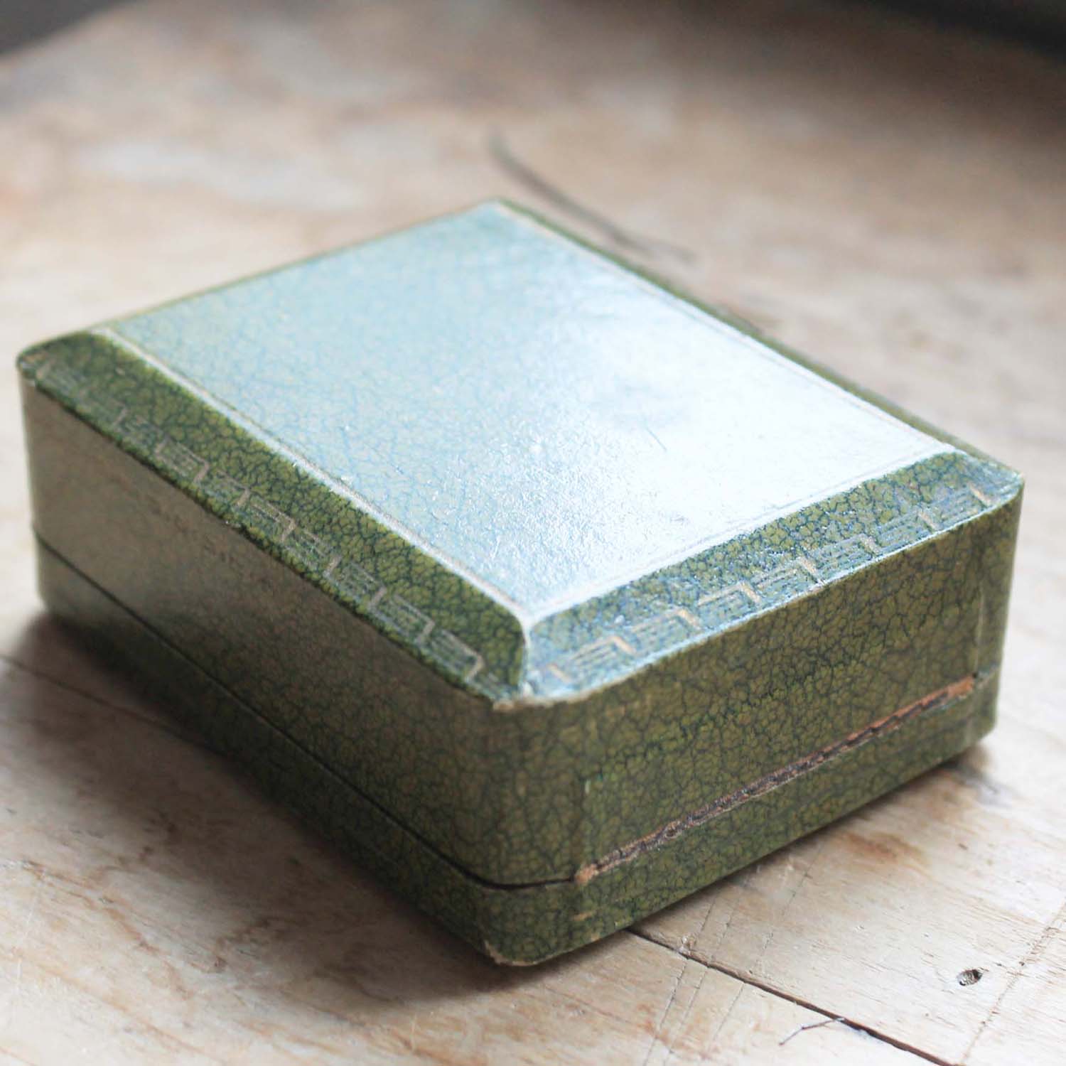 100年ぐらい前の古い宝石屋さん用の箱。 女性用の懐中時計か、ペンダントヘッドを入れるための物だったと思います。古いものなので傷、汚れ、布の切れがあります。