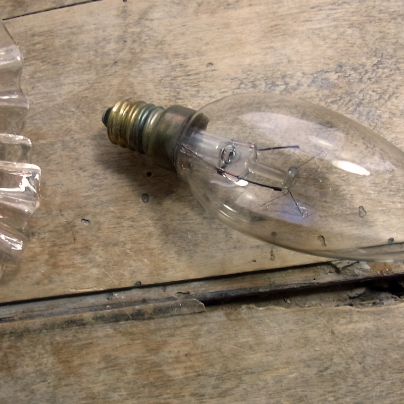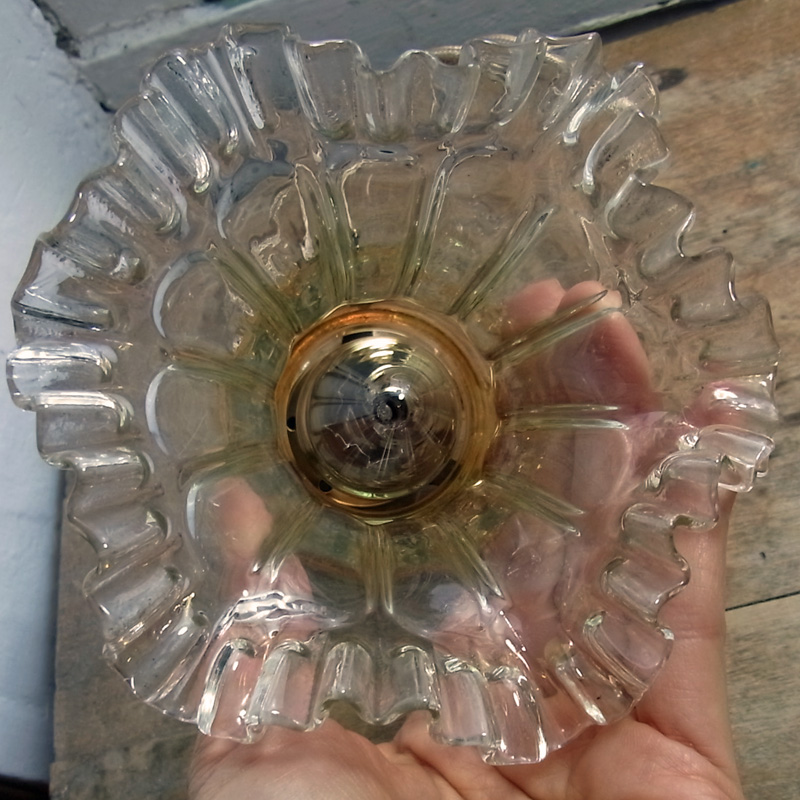古いガラス製のランプシェード。 光沢のあるヴァセリンガラスのような色合いが素敵です。 ランプシェードはアンティークですが、ブリキの金具(E14シャンデリア球が入ります)、電線等は新品です。 淵に小さなかけがありますが、使用するには問題ありません。