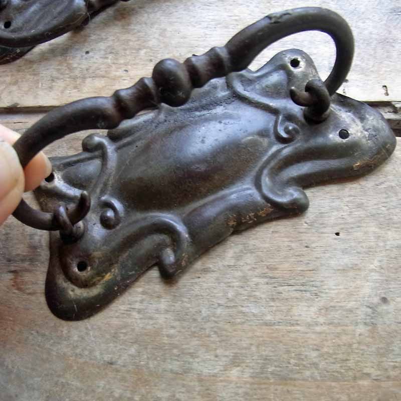 古いブリキ&鉄製の取っ手。 アールヌーボーのデザインが素敵です。100年ぐらい前のものなので錆が全体的に入っています。