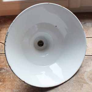 ミッドセンチュリーのホーロー製のランプシェード。工場や農家で使われていたものです。電球のソケットは真鍮&ポーセリン製です。電球はフランスの差し込み式が入ります。古いものなのでホーローの欠け、さび、汚れがあります。