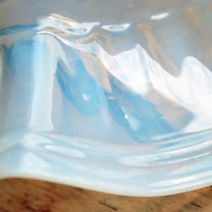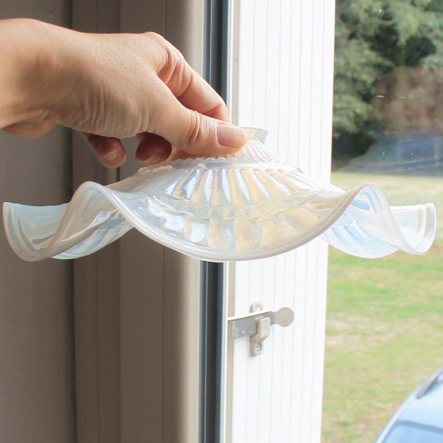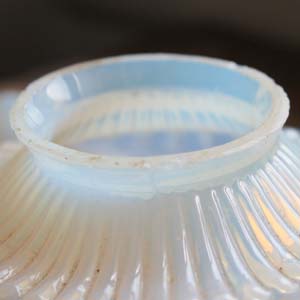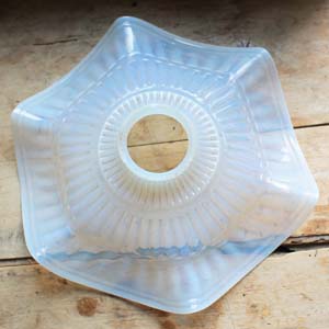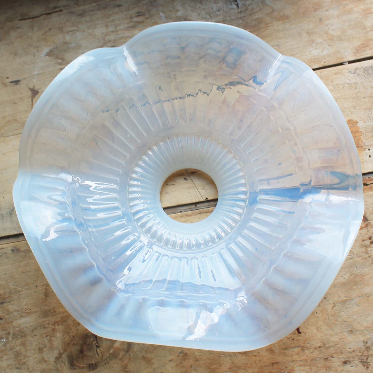 オパールセントグラスのランプシェード。型吹きグラスなので、多少のガラスのよれ、気泡、ソケット口に欠けがありますが、ソケットを装着すると見えなくなります。