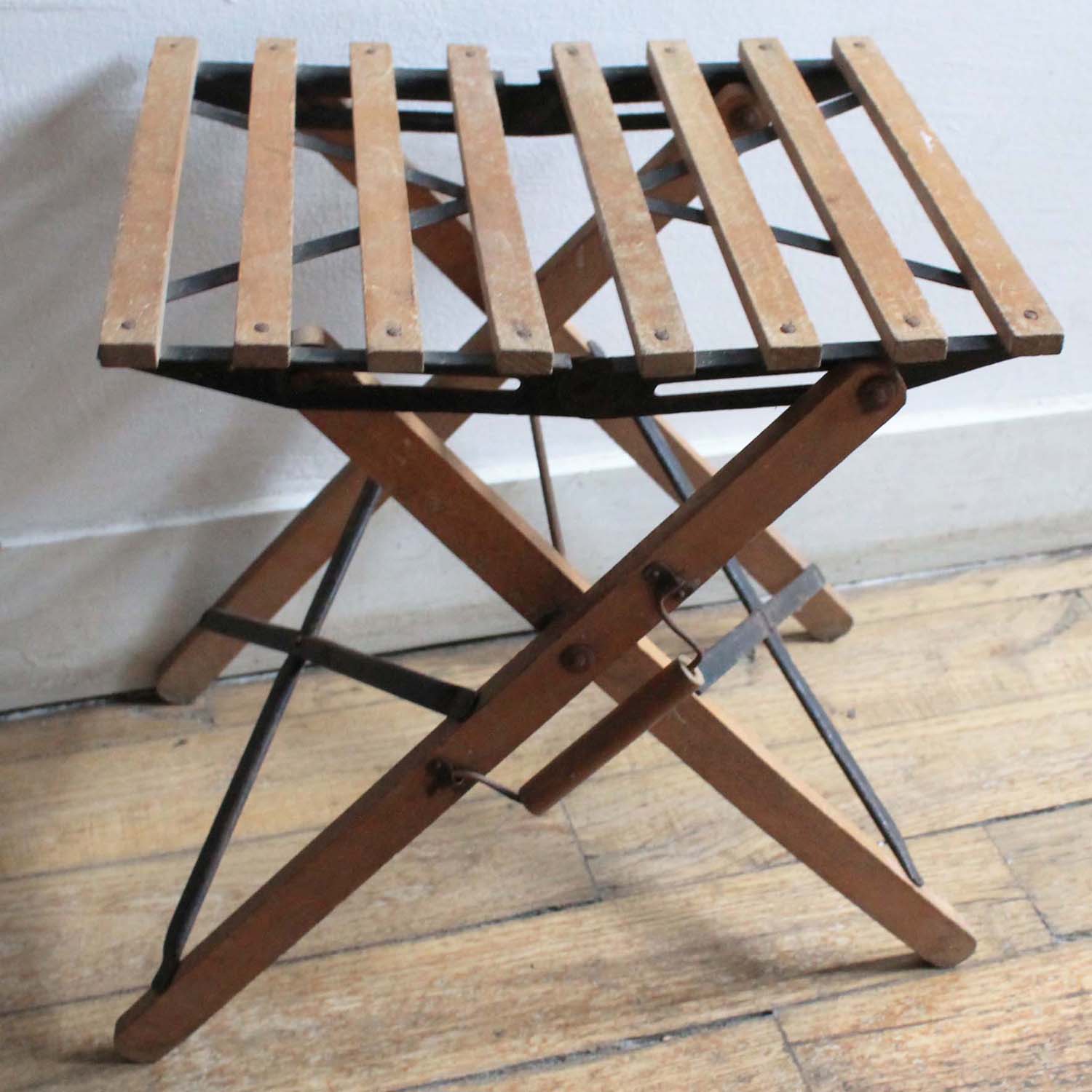 100年ぐらい前の古い折り畳み式のスツール。古いものなので多少の傷、汚れ、さびがあります。