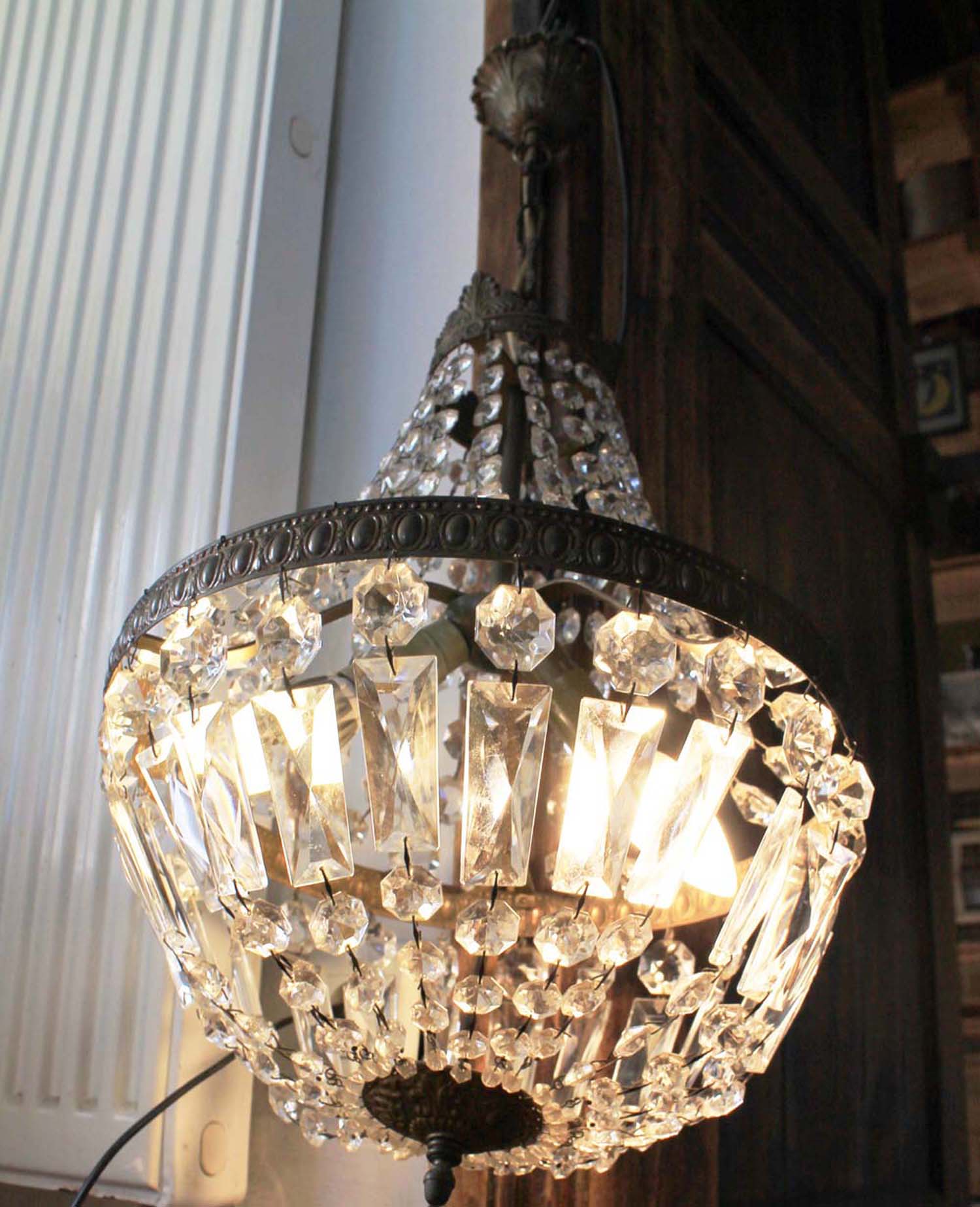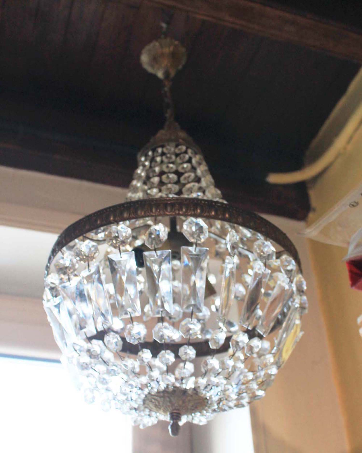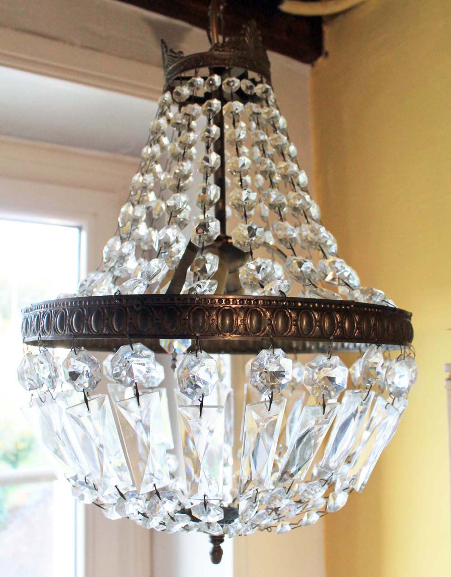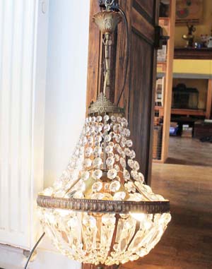 古い天井用シャンデリア。 エンパイアスタイルです。古いものなので金属部分に修繕が入っていますが、ガラスの中にあるのでわかりません。電球はE14のシャンデリア球、ワイヤーはフランス式になります。状態を鑑みてお安めのお値段を付けました。