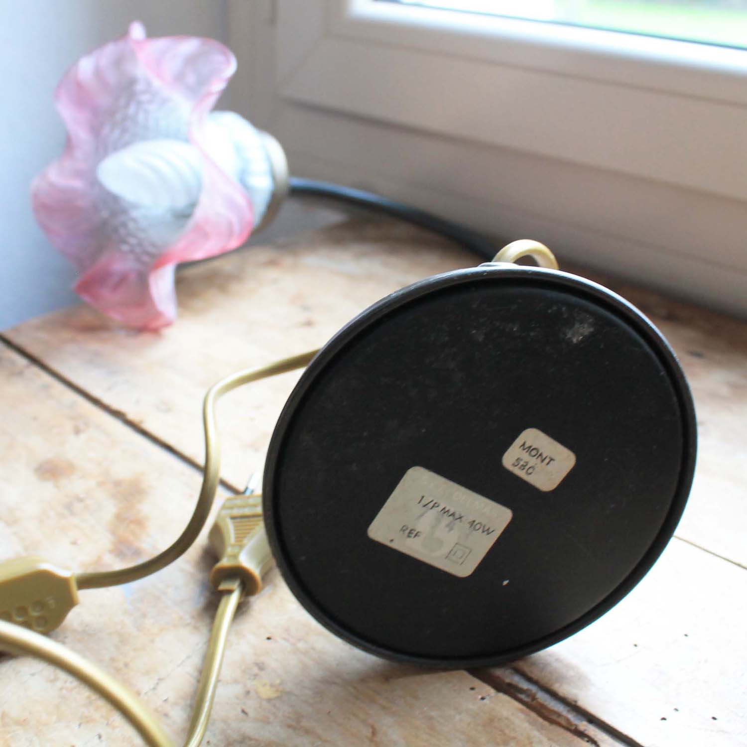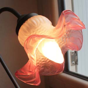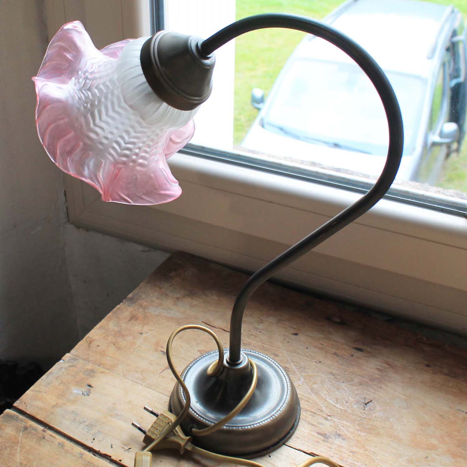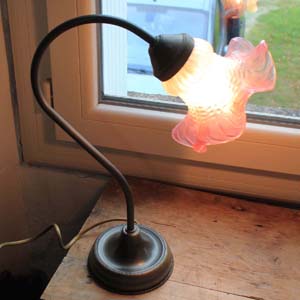 ピンクのグラデーションのガラスシェードがかわいいデスクランプ。電球はE14のシャンデリア球。電線等はすべてフランス式です。古いものなので多少の傷、汚れがありますが、欠け、ラインはありません。