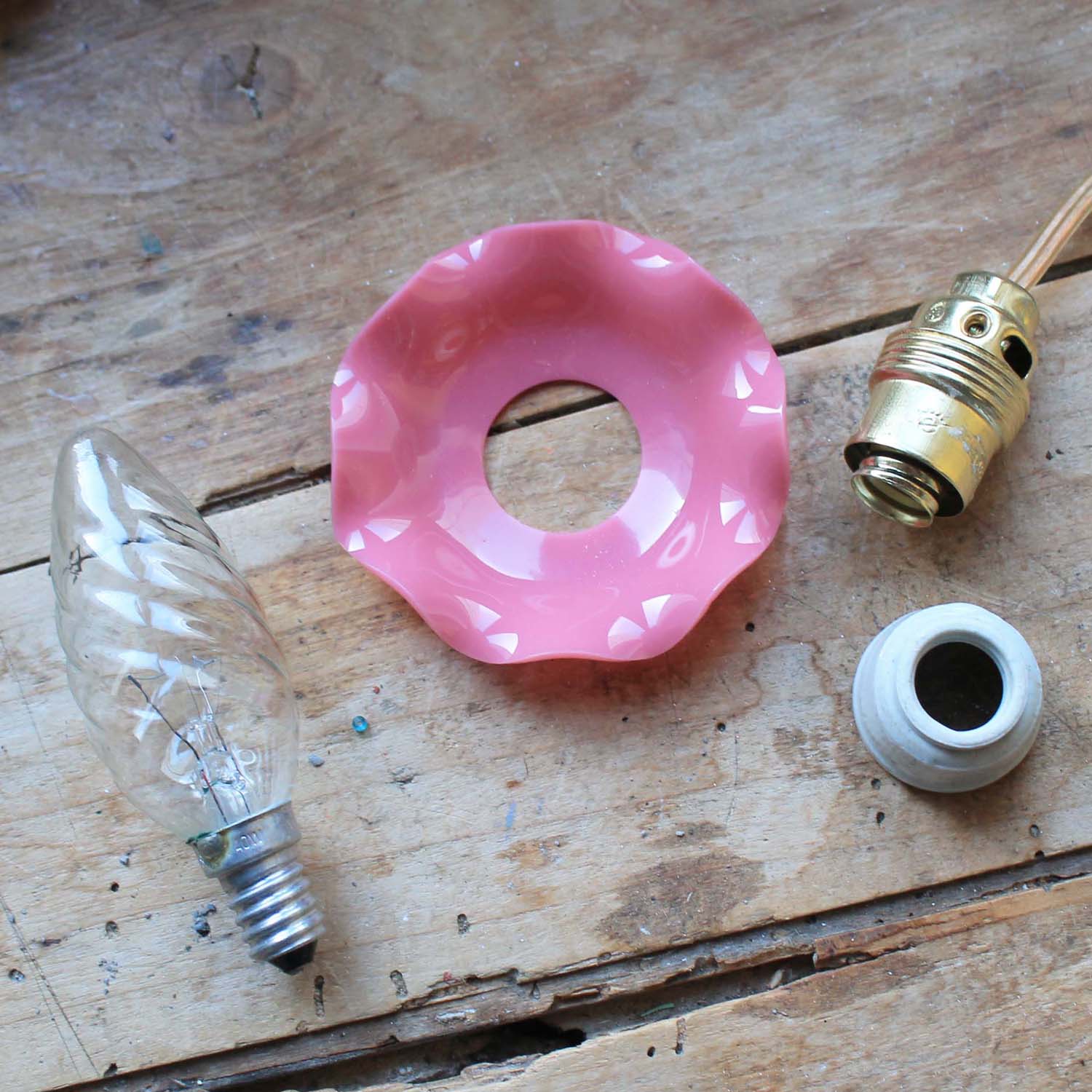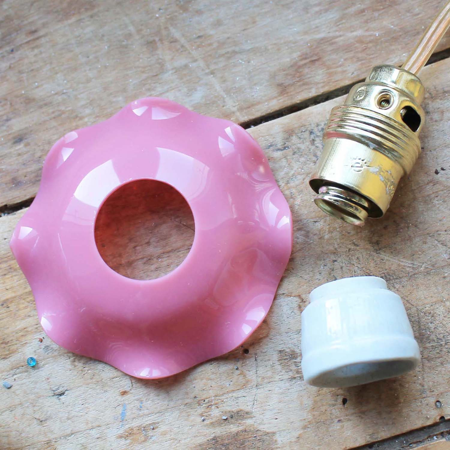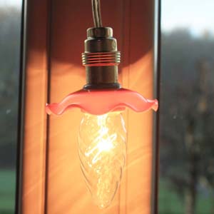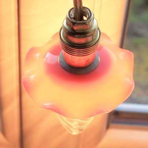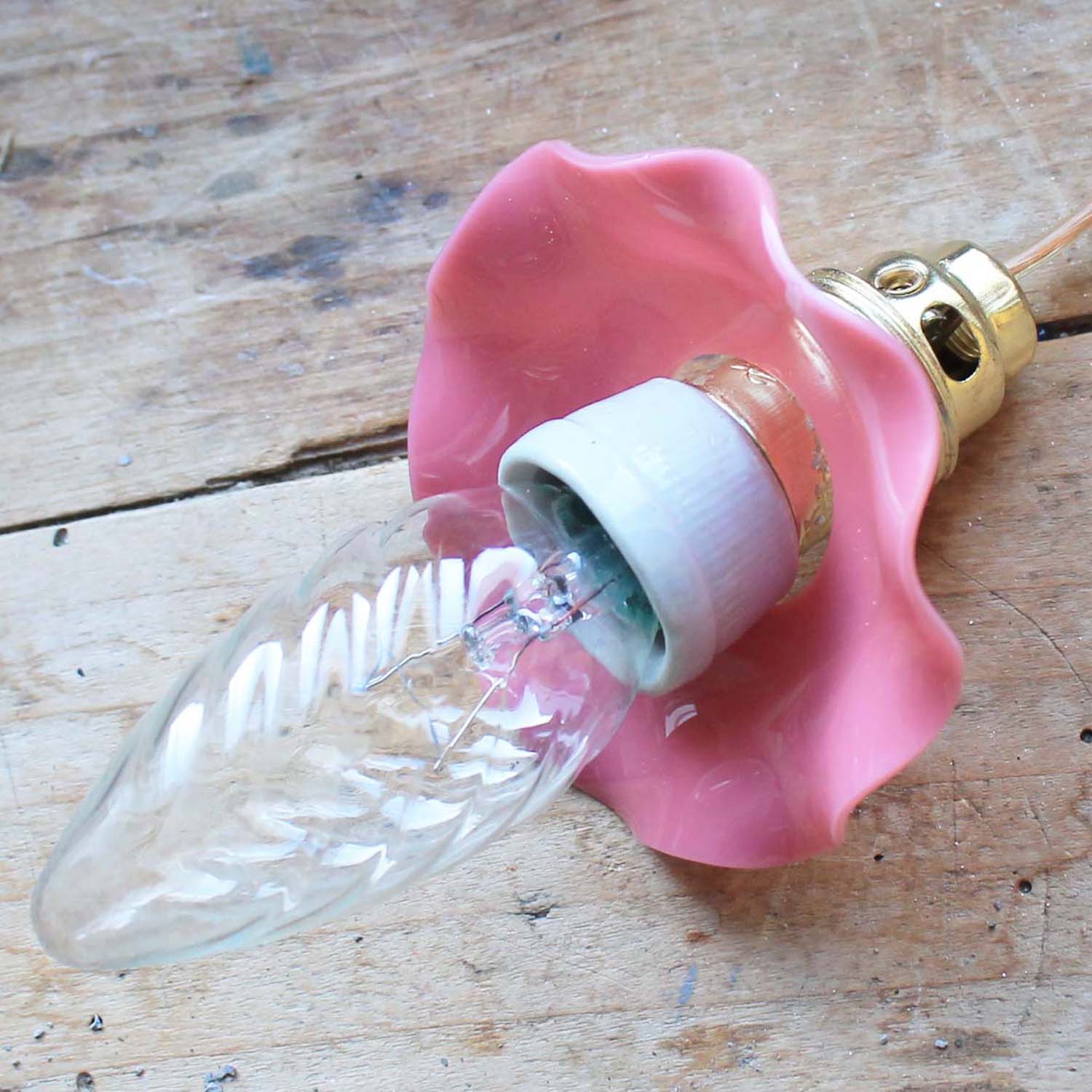 ガラスのペンダントランプ。ピンクの小さなシェードがかわいいです。 電球はE14のシャンデリア球が入ります。ソケット(新品)の一部分はポーセリン製になります。ガラス部分は古い物なのですが、欠け、ラインはありません。