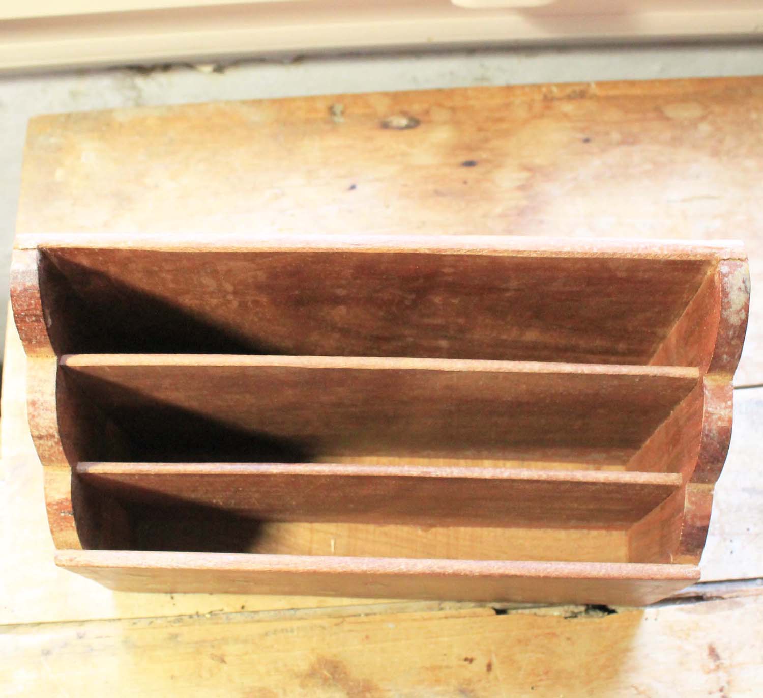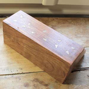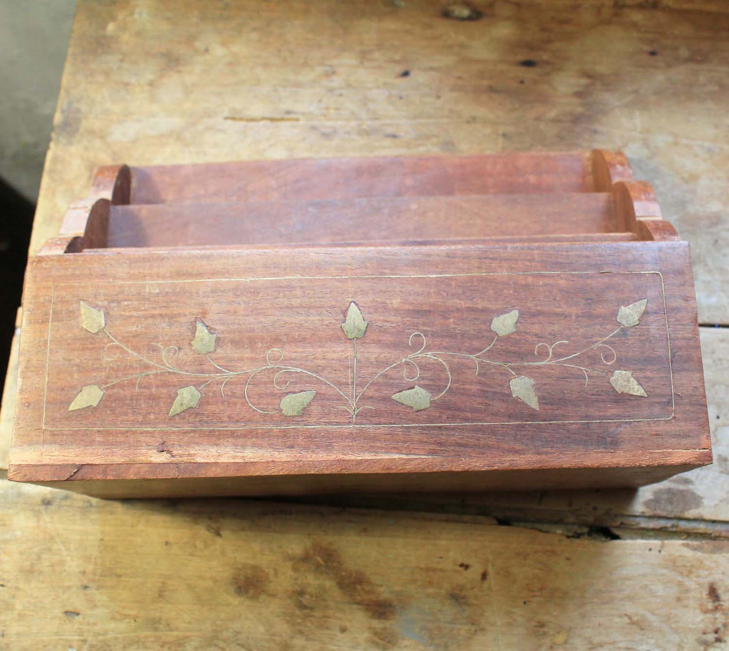 古い木製の書類入れ。装飾として金属のインレイが入っています。古いものなので多少の傷、汚れがあります。