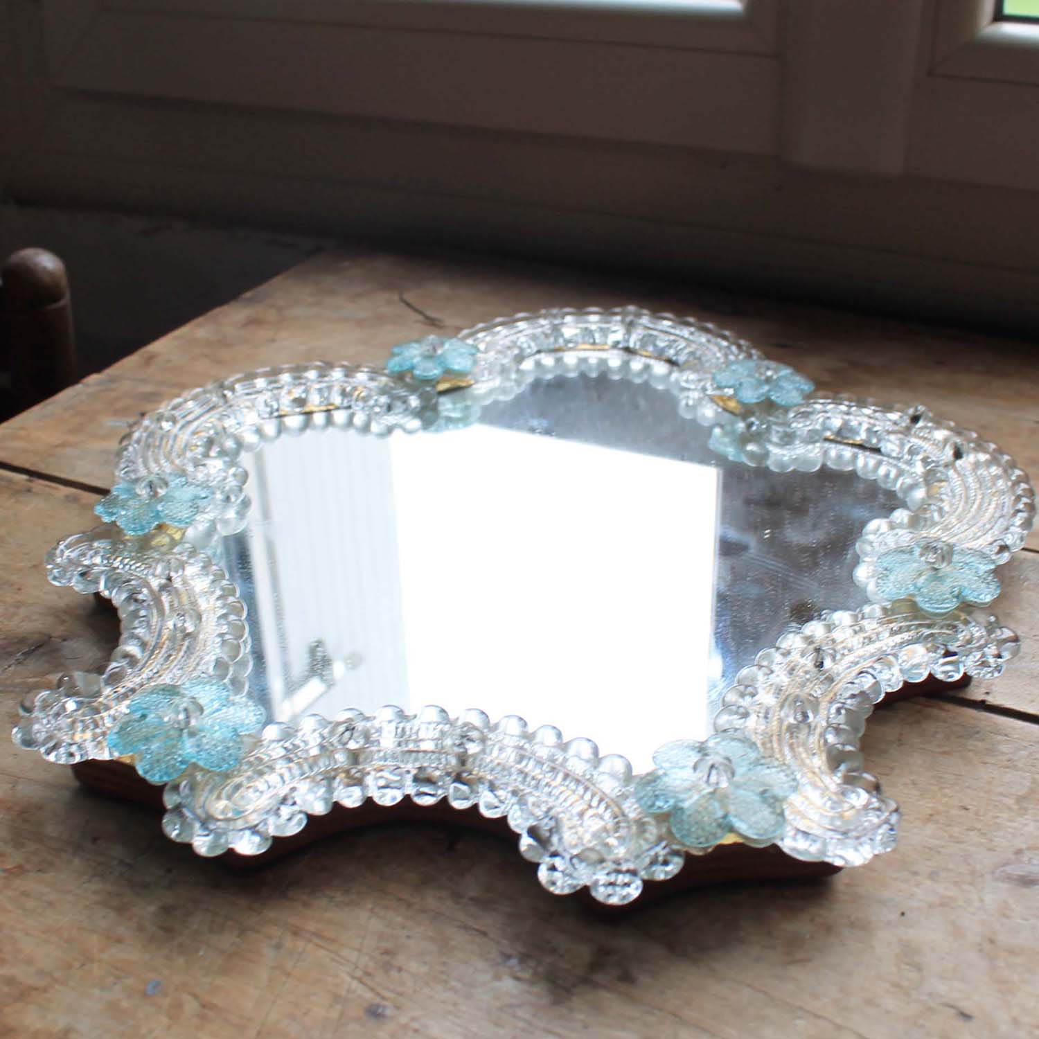 イタリア ムラノグラス製の鏡。表側にダメージはありません。裏の支えが無くなっていますが、壁にかけられるようになっています。