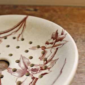 100年以上前の古い陶器製のトレイ。 石鹸を入れるものなので水切りできるよう穴が開いています。 アールヌーボー時代のシックな絵柄が素敵です。 古いものなので貫入、ヘアラインがありますが、欠け、ラインはありません。