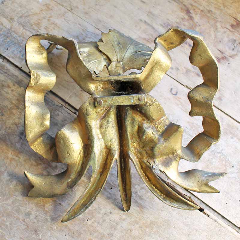 大降りの真鍮製の家具用飾り。 リボンにリーフがモチーフです。古いものなので、傷、汚れがあります。