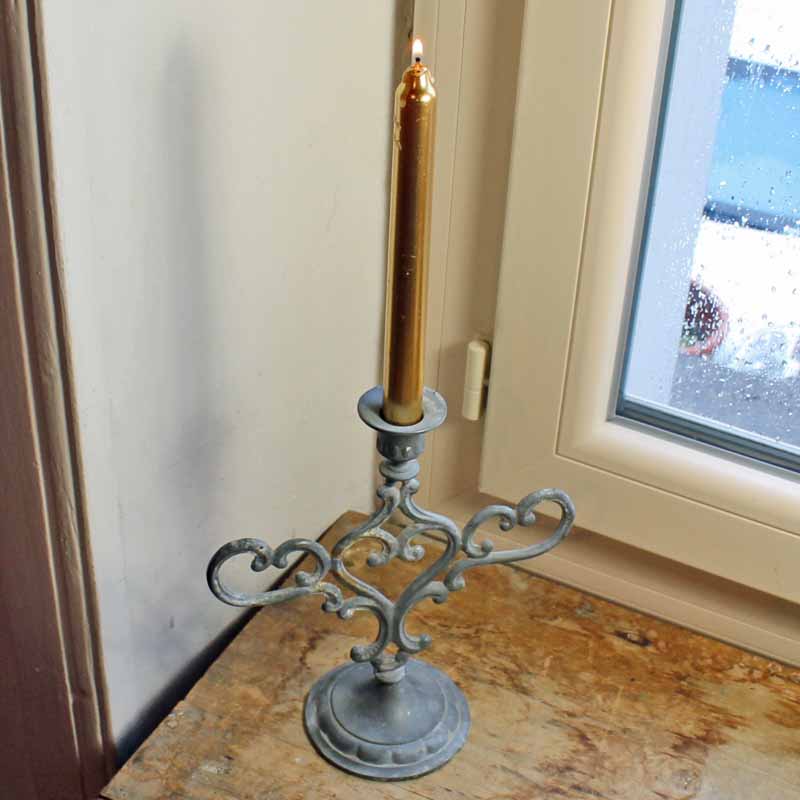 古いピューター製のキャンドルスタンド。 ハートのモチーフがかわいいです。古いものなので、金属の変色、汚れがあります。
