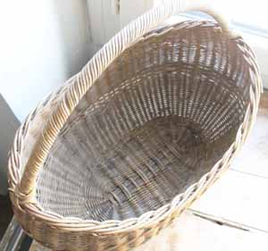 古い籐製のバスケット。古いものなので多少の傷、汚れ、藤の割れがあります。
