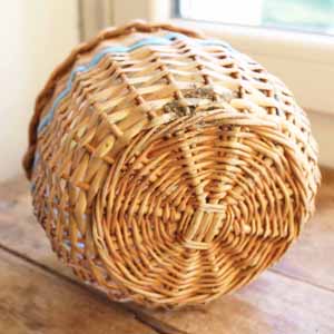 水色のラインがかわいい小さめの古いパニエ。古いものなので傷、汚れ、籐の折れがあります。