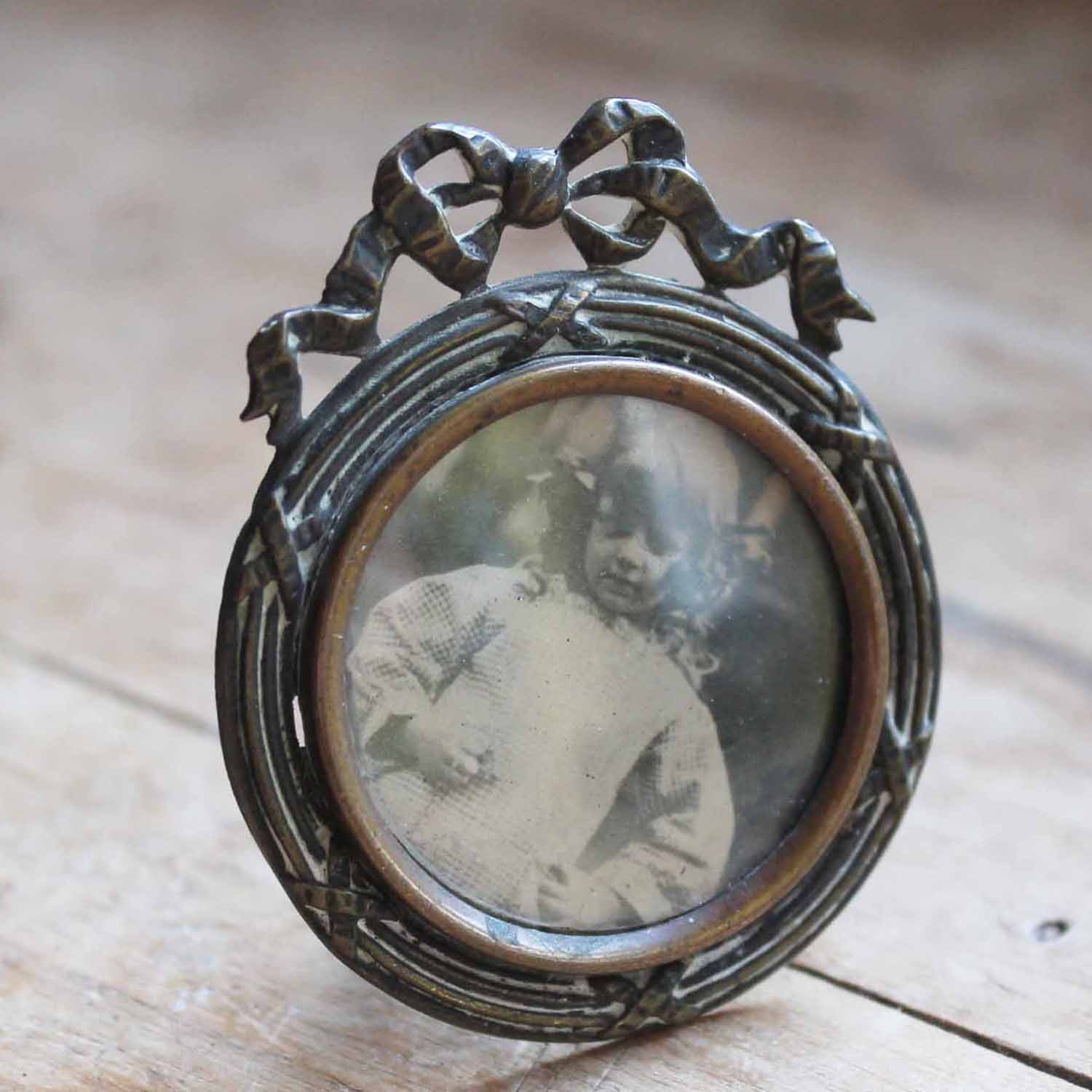 小さなポートレート写真を入れるための額。中に少女の写真が入っています。リボンモチーフがかわいいです。古いものなので多少の傷、汚れがありますが、ガラスにダメージはありません。