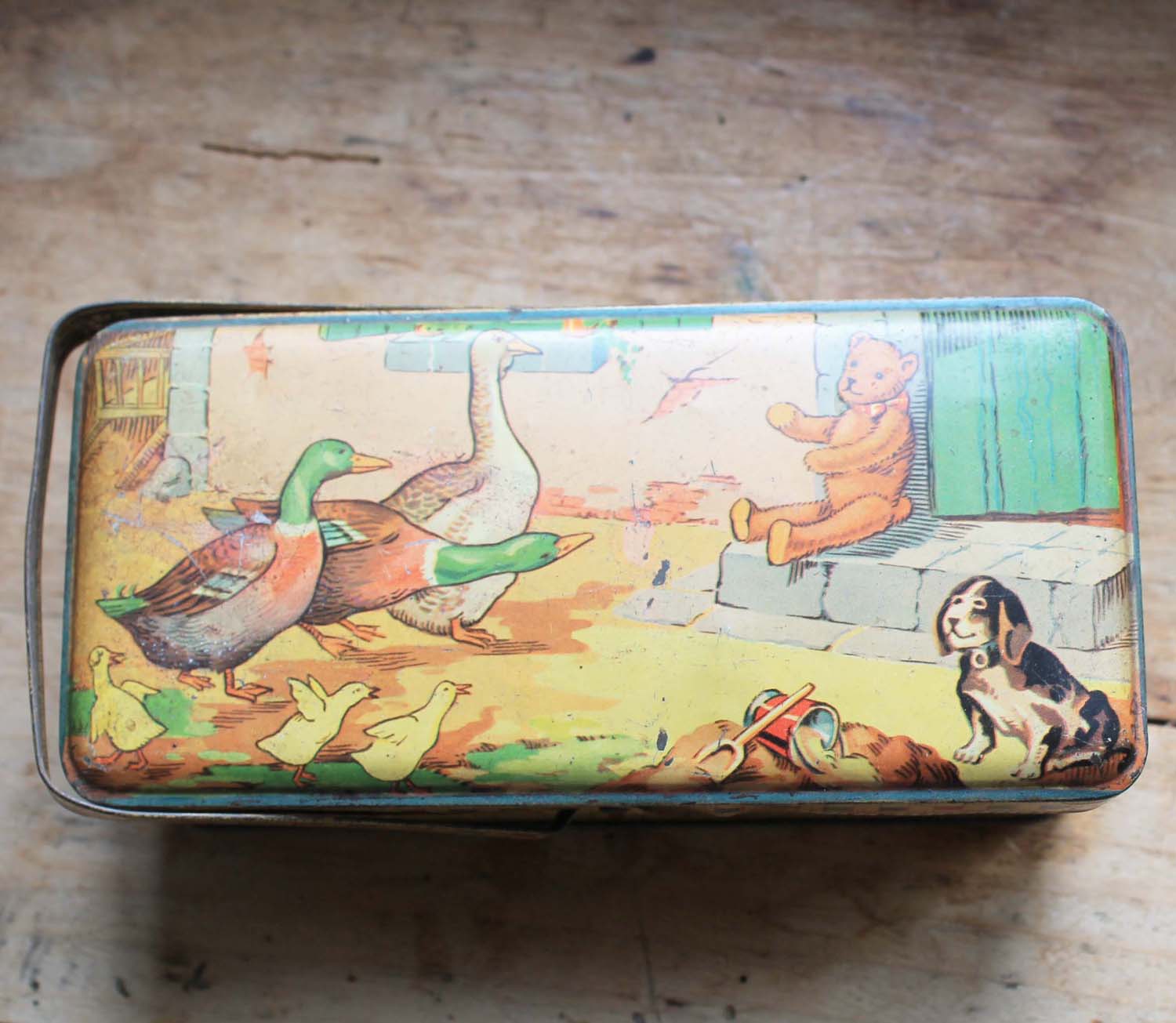 デザインがかわいいお菓子用の缶。取っ手がついています。古いものなので多少の傷、汚れ、さびがあります。