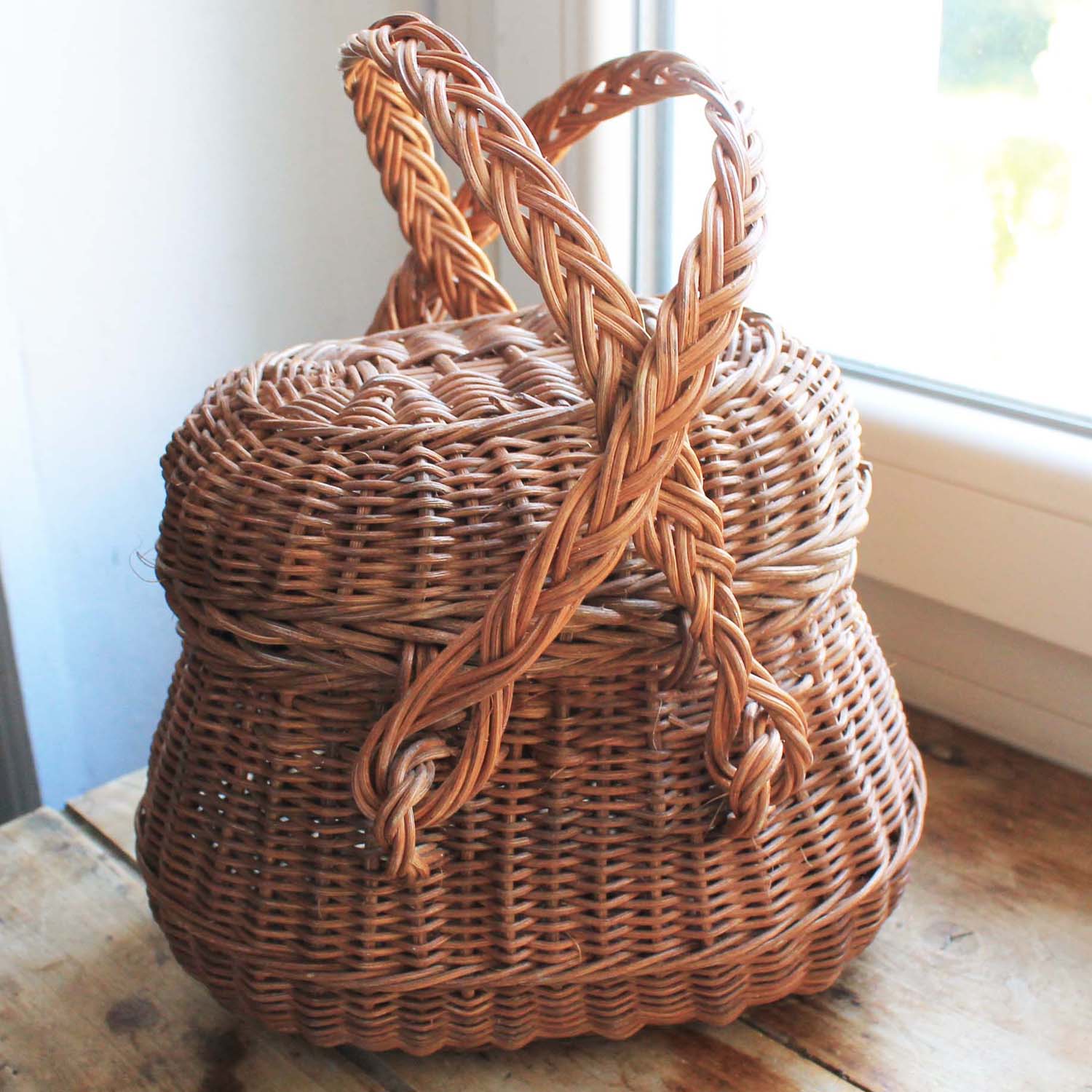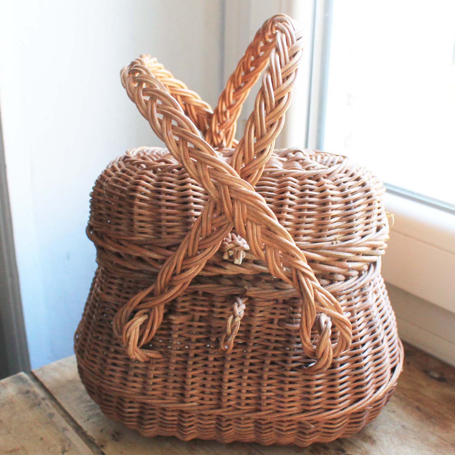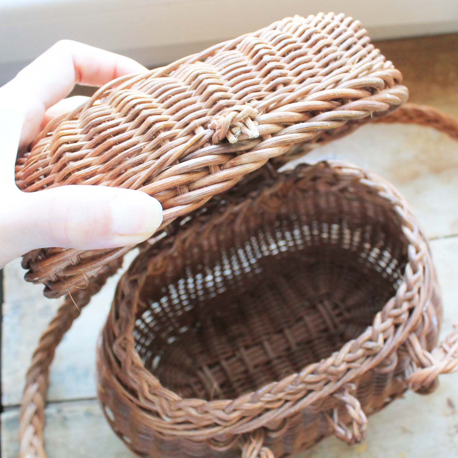 古い籐製のバスケット。おもちゃタイプではなく、子ども用になります。古いものなので蓋と本体のフック部分が取れてなくなっていますが、使用できます。