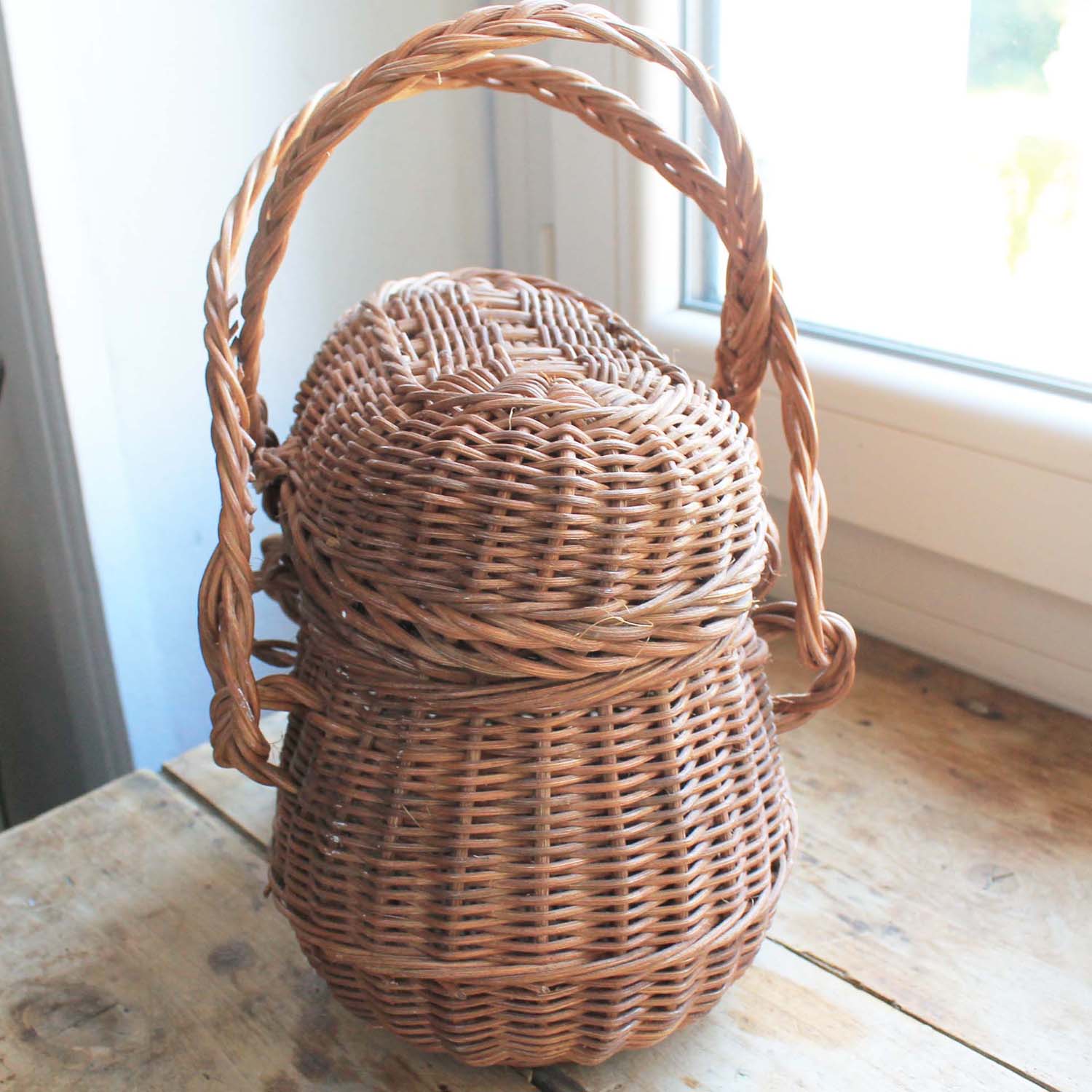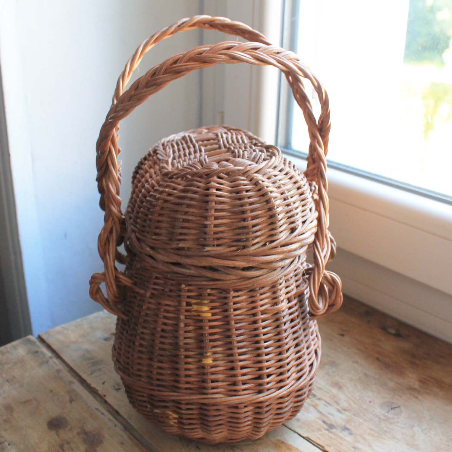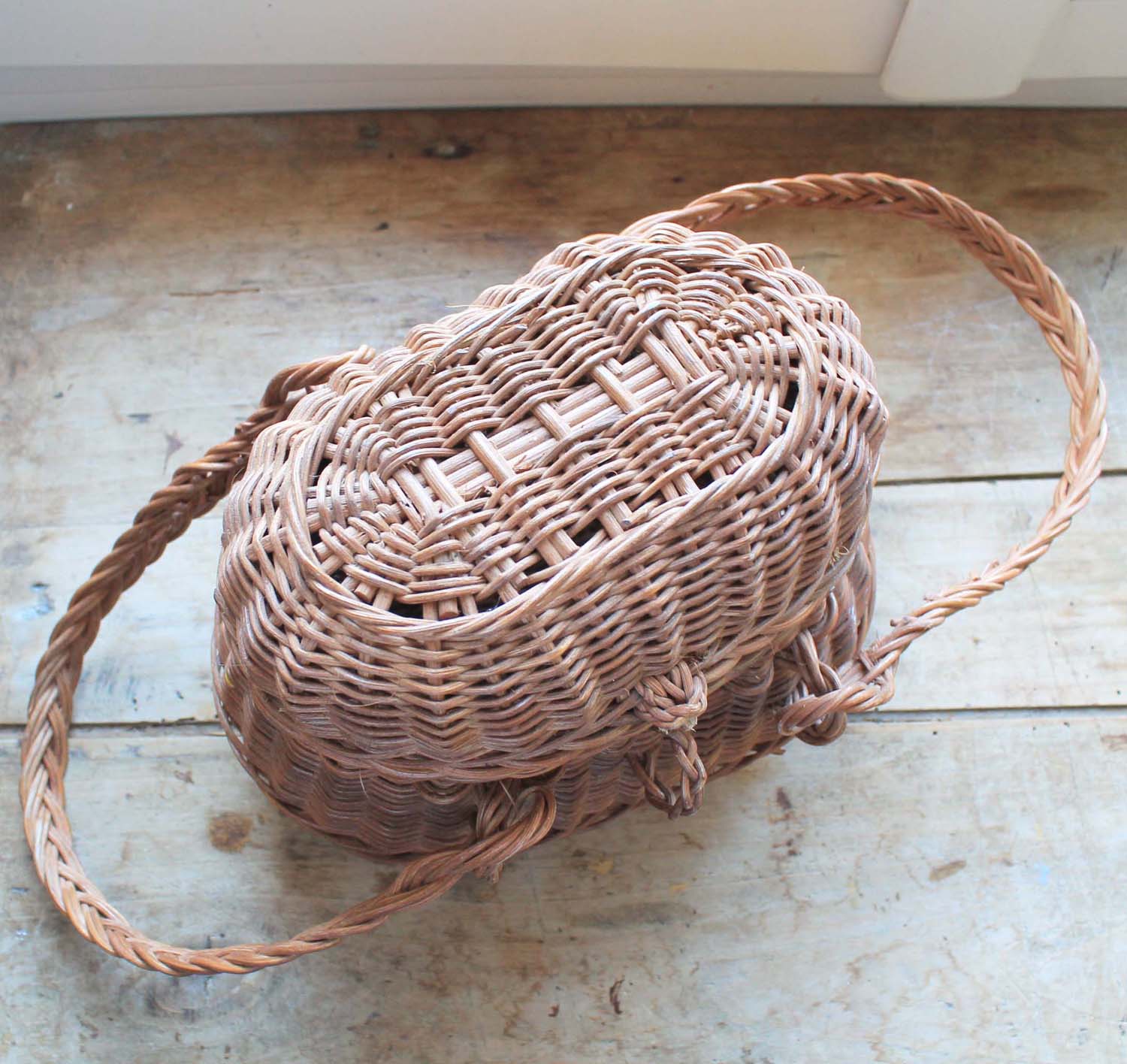 古い籐製のバスケット。おもちゃタイプではなく、子ども用になります。古いものなので蓋と本体のフック部分が取れてなくなっていますが、使用できます。