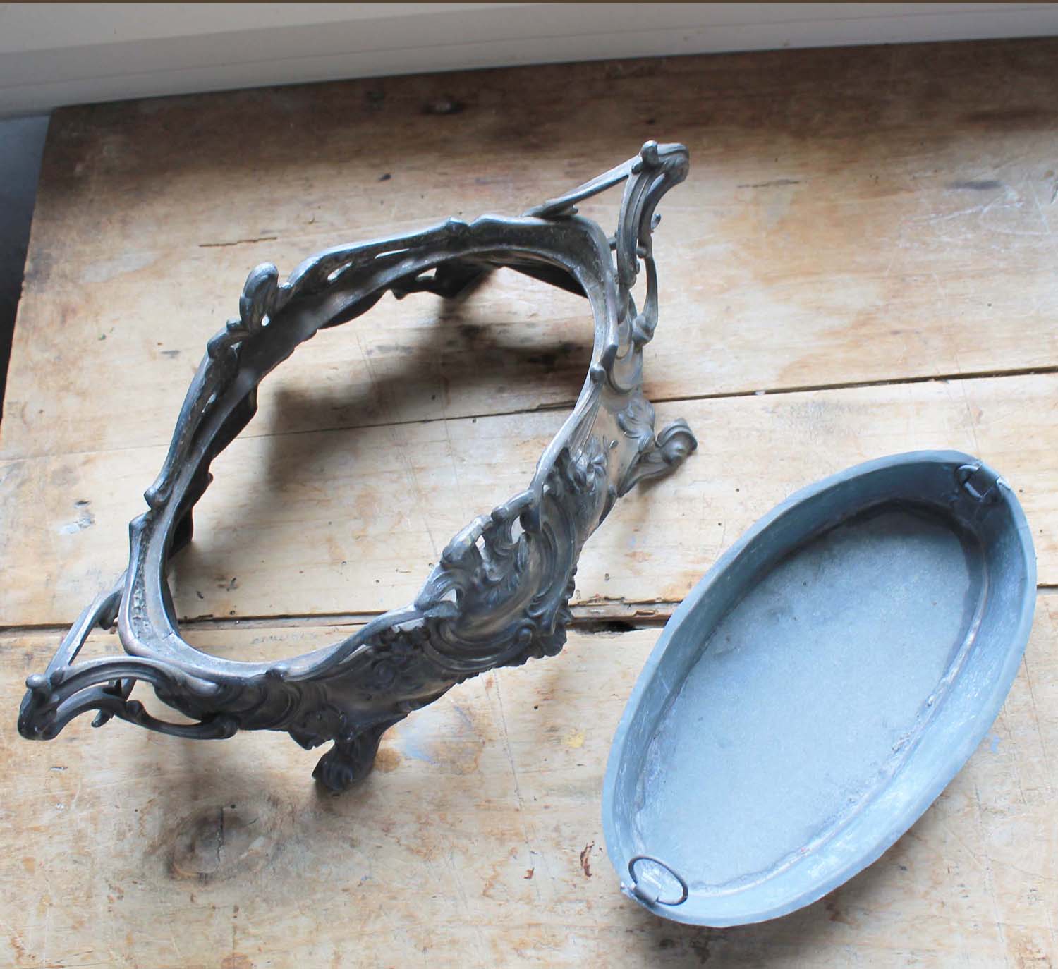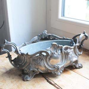 100年ぐらい前の古いピューター製のジャーディ二エール。ロココです。古いものなので多少の傷、汚れがありますが、目立つダメージはありません。