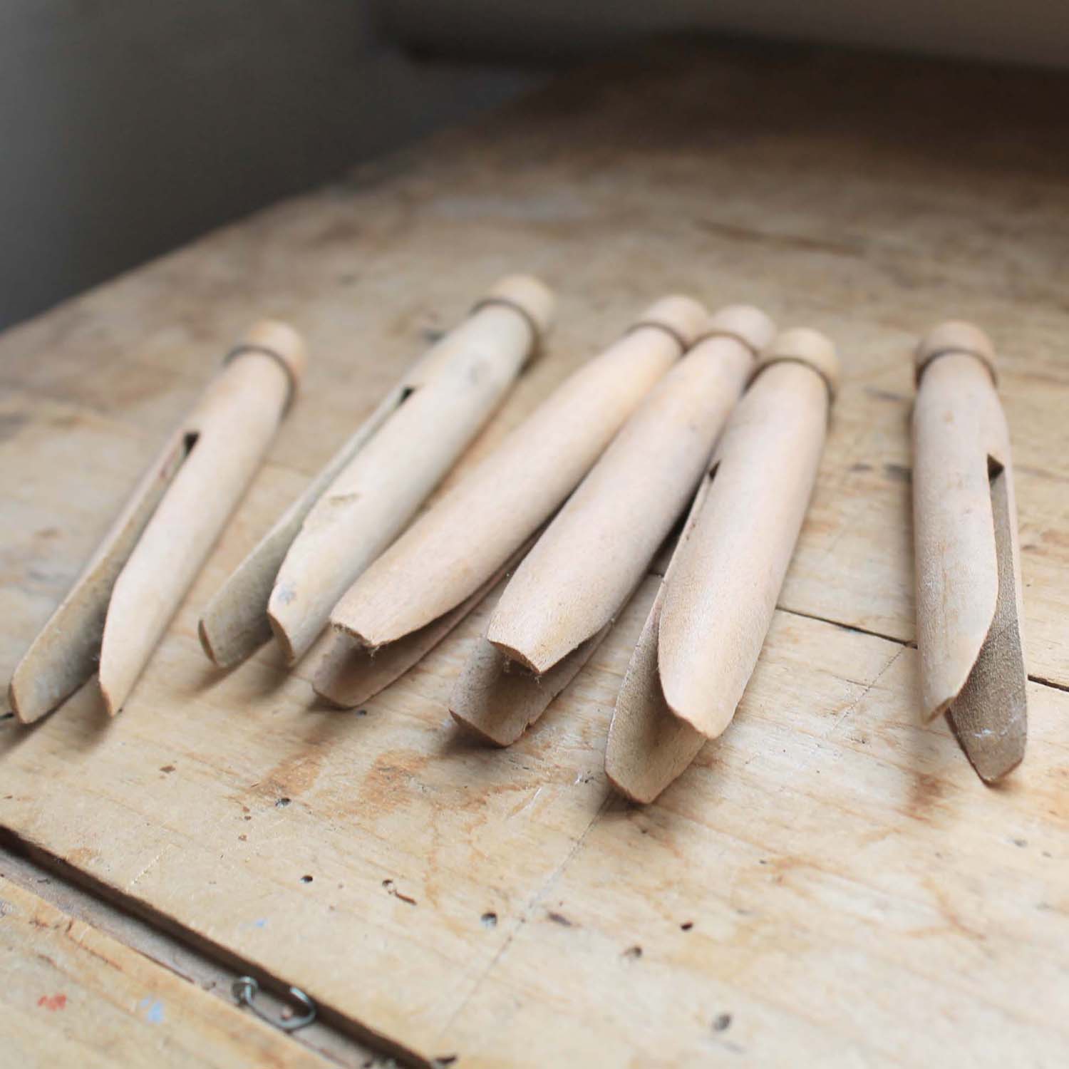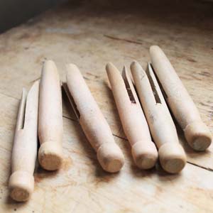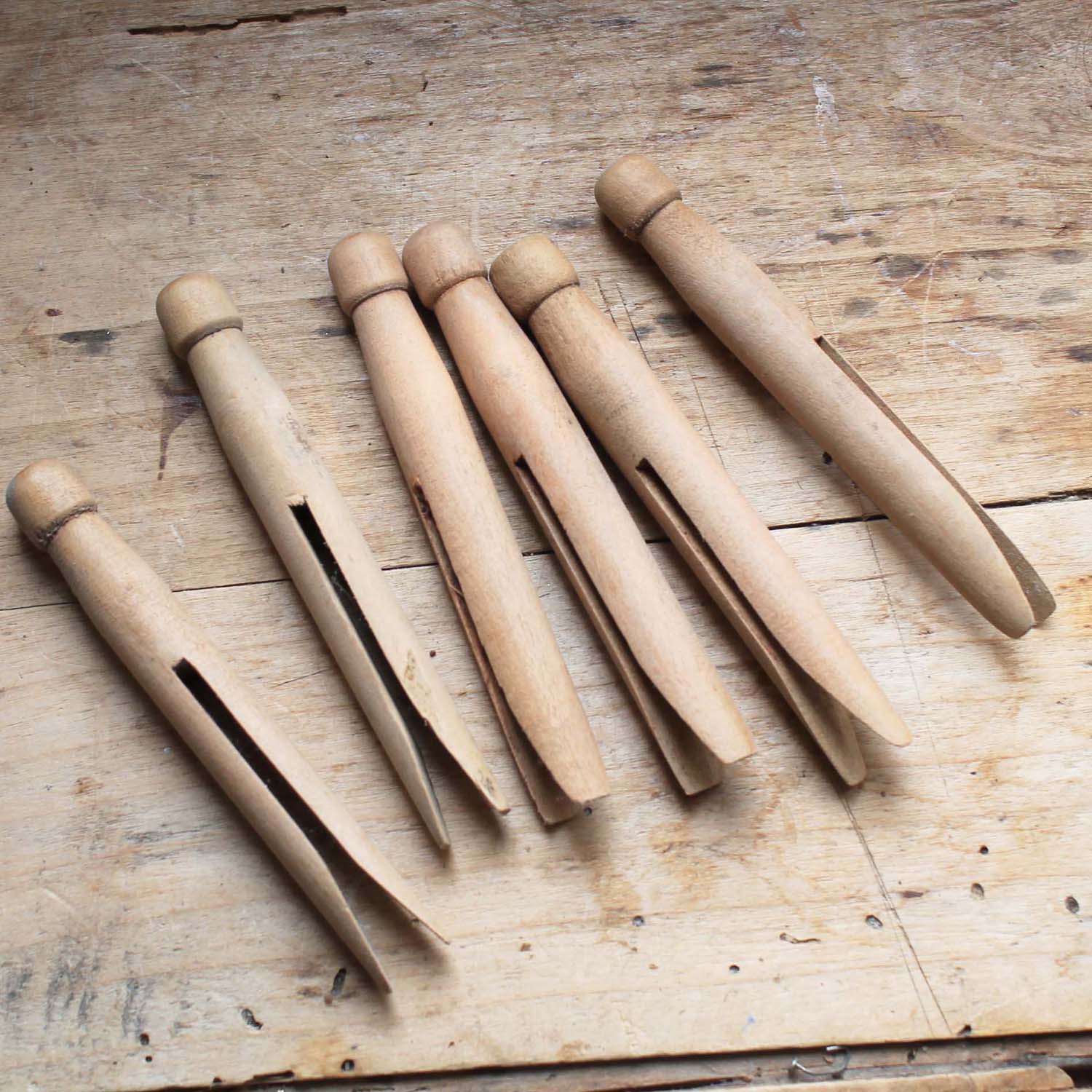 古い木製の洗濯ばさみ、6個セット。古いものなので多少の傷、汚れがあります。