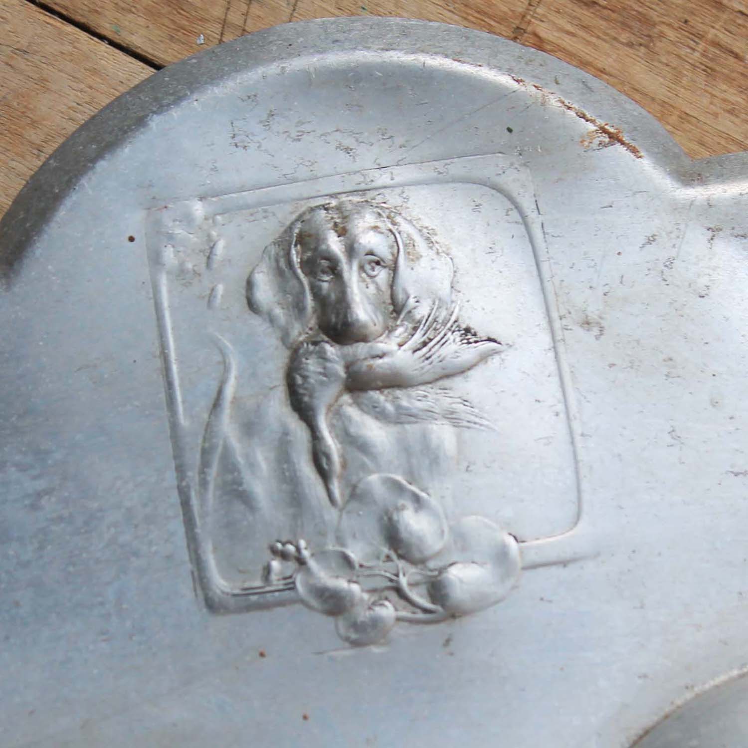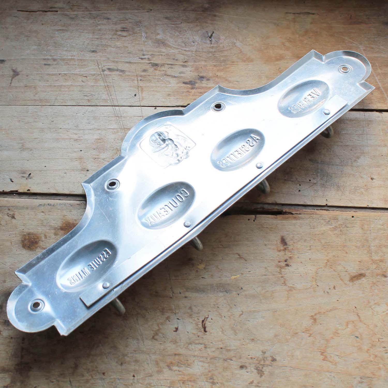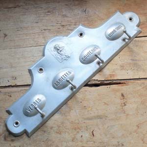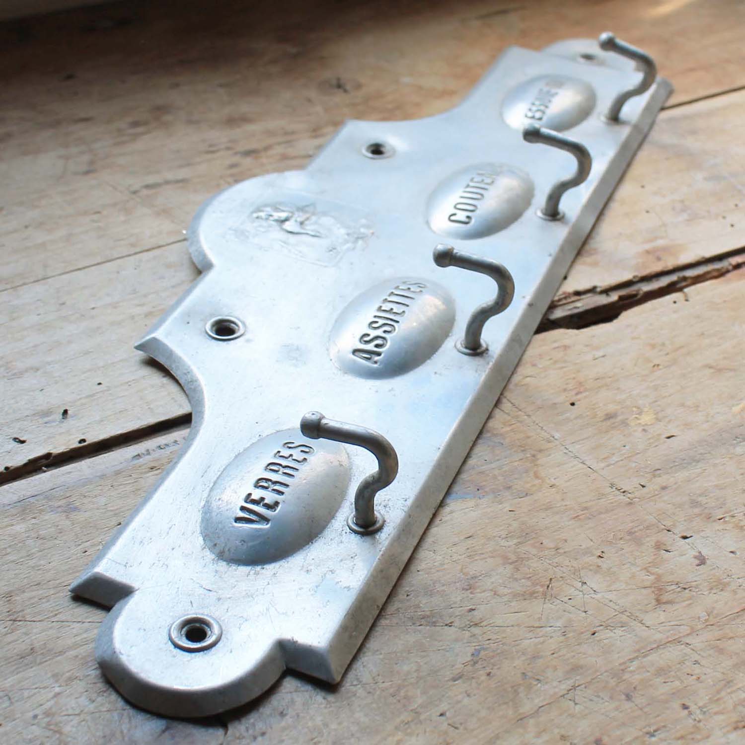 古いアルミ製のトーション用のフック。 Verres(ガラス)、Assiettes(お皿)、Couteaux(カトラリー)、Essue Mains(手拭き)と用途に分けたトーションをかけられるフックです。古いものなので多少の傷、汚れ、でこぼこがあります。