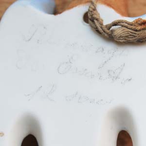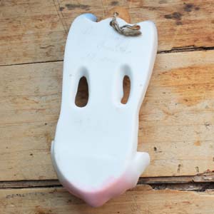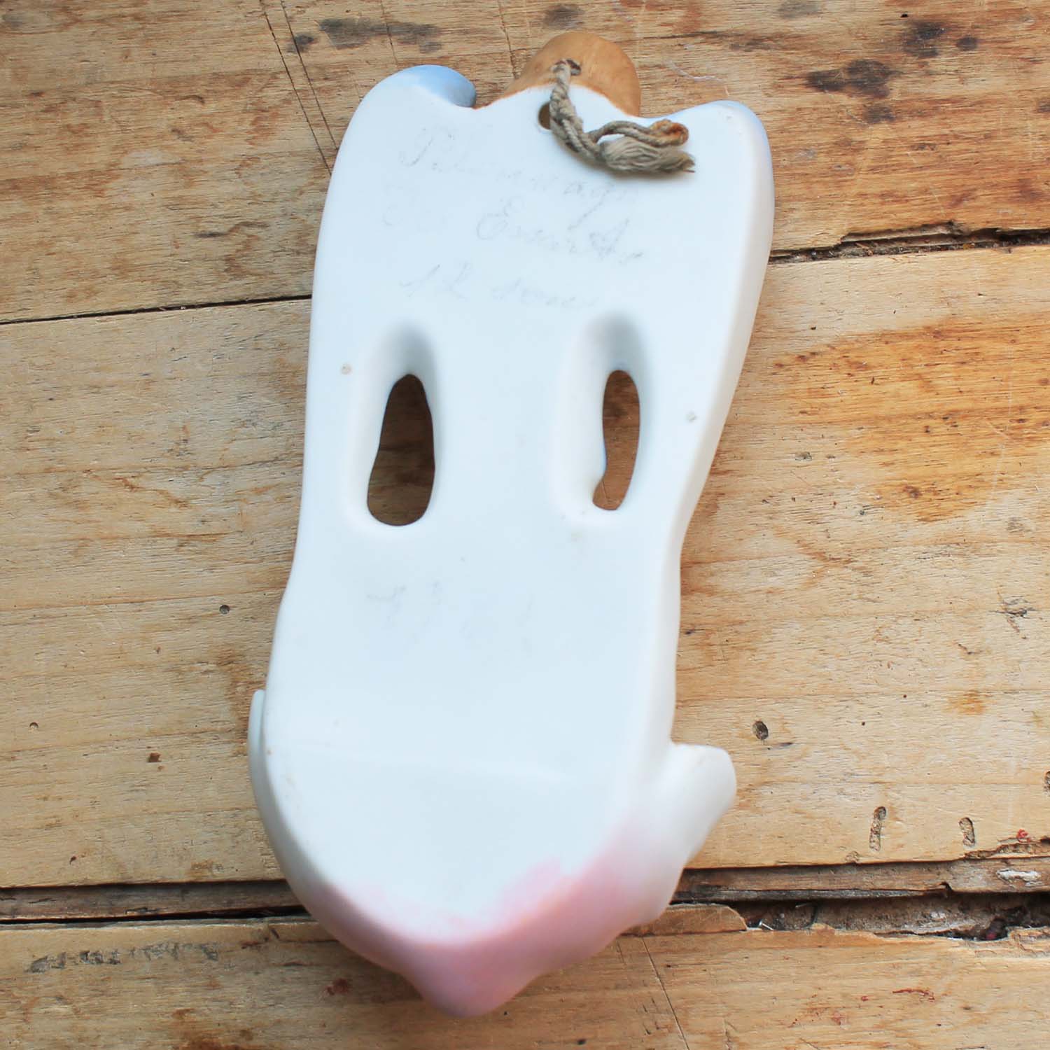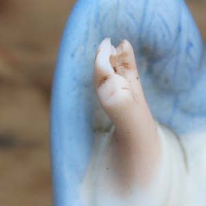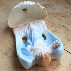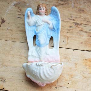 古いポーセリン製の聖水入れ。 エンジェルがモチーフです。古いものなので指が取れています。裏側に当時の鉛筆書きが入っています。