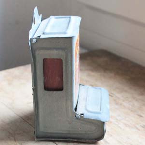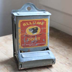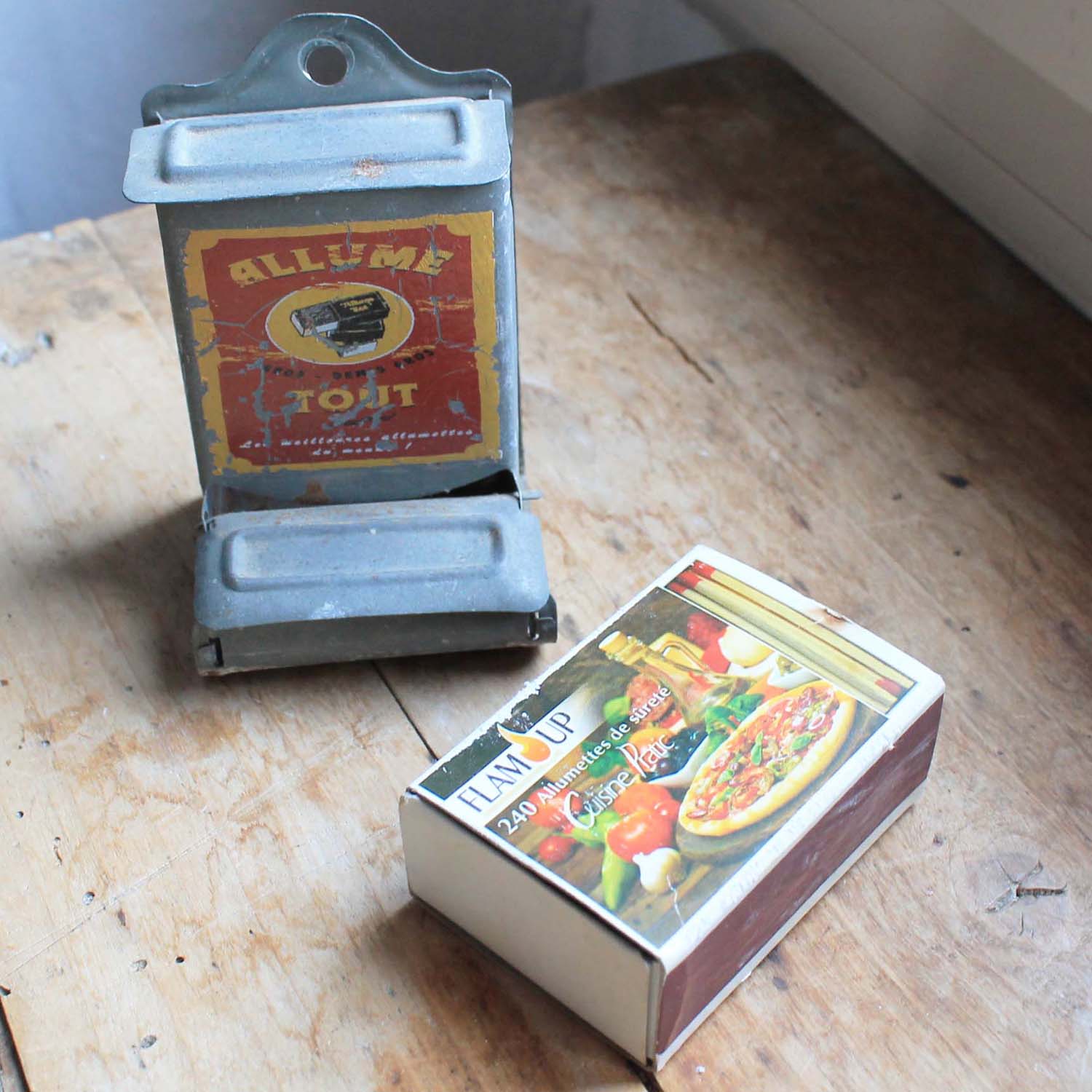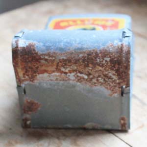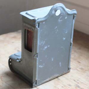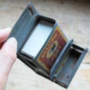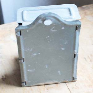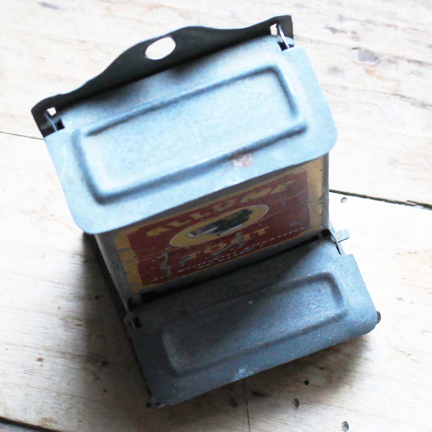 古いマッチ用の容器。中にマッチを入れられるようになっています。古い物なので傷、汚れ、さびがあります。