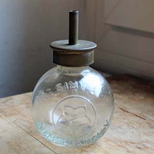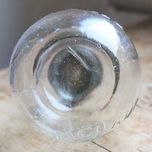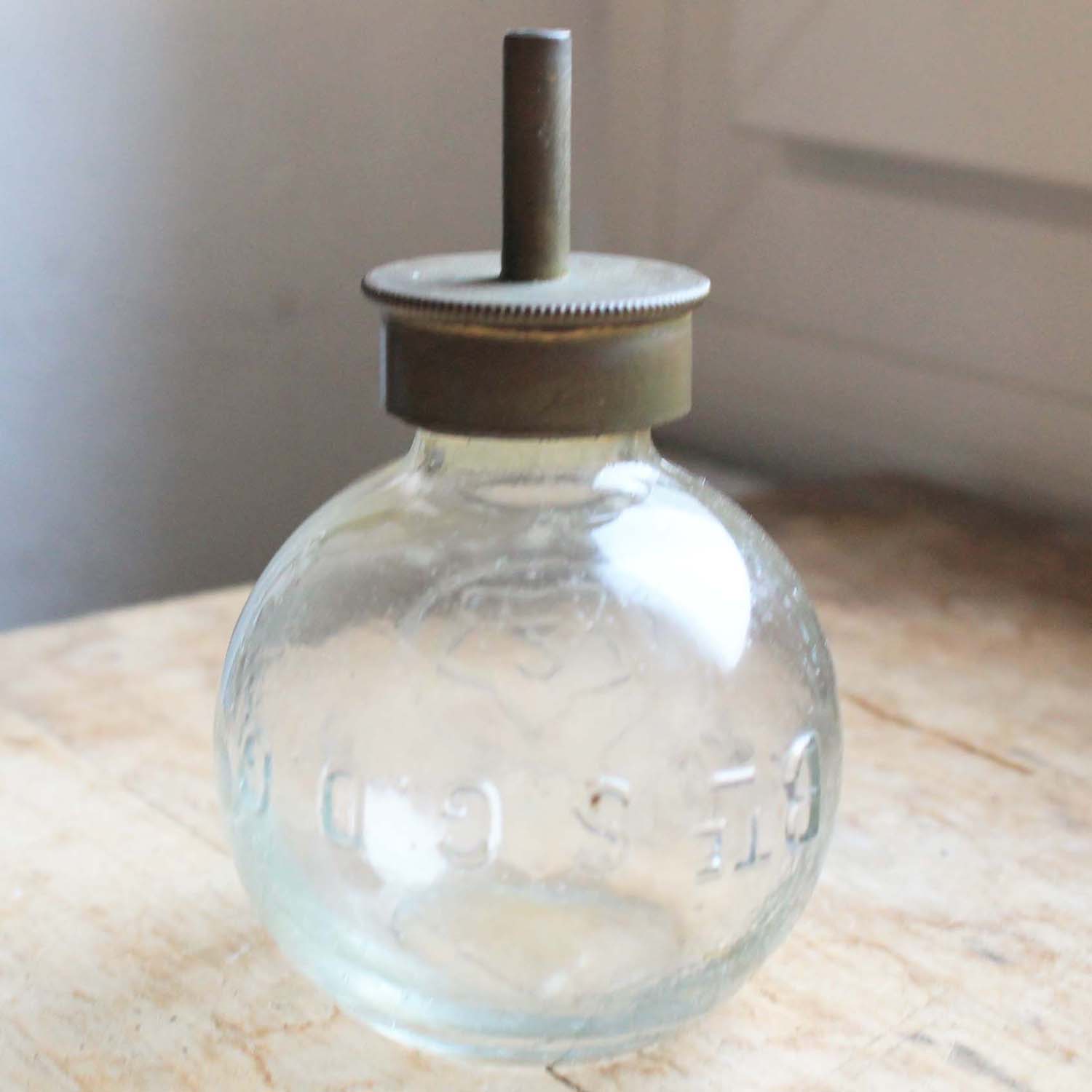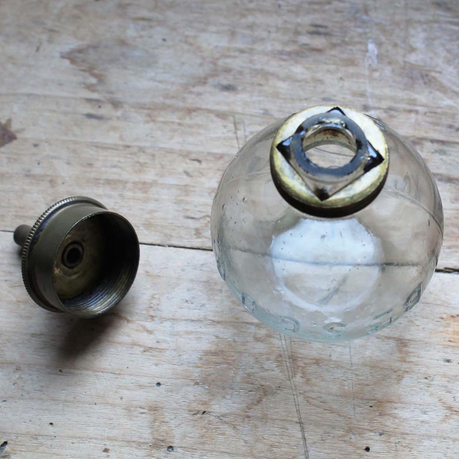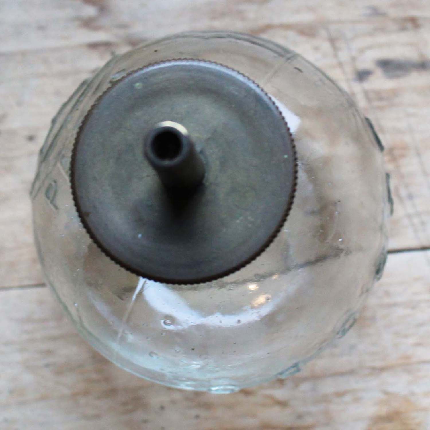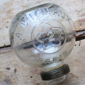 100年近く前の古いオイルランプ。 パリのA. Michauxと刻印が入っています。型吹きグラス製です。古いものなので多少の傷、汚れがありますが、欠け、ラインはありません。