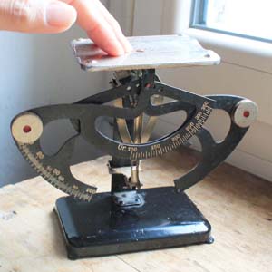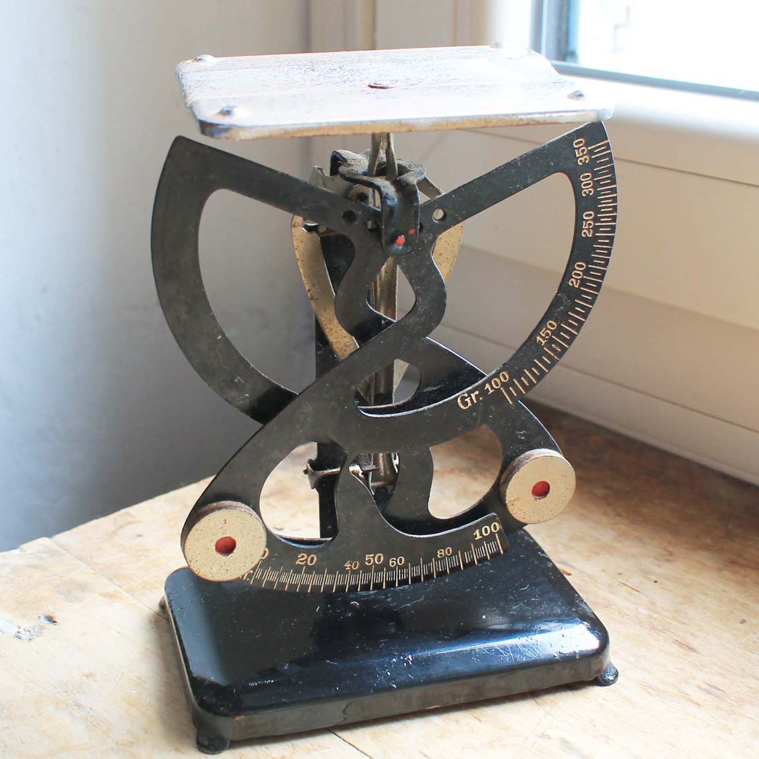 古い手紙用の秤。傷、汚れ、さびがあります。