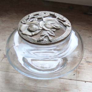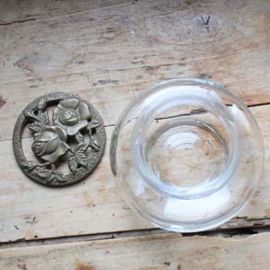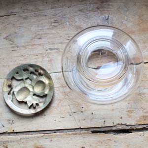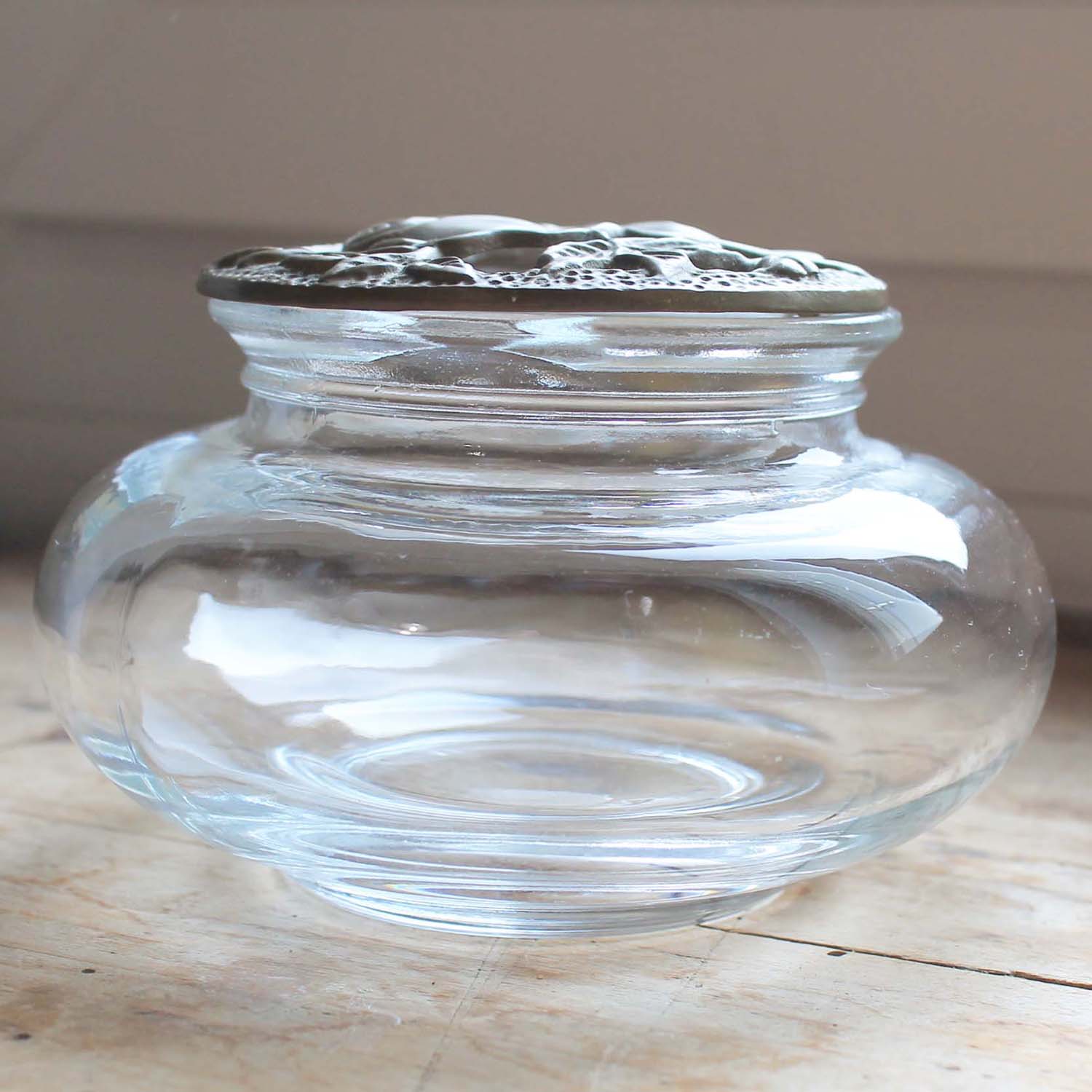 中古のポプリ用ポット。ふたは金属、ポット部分はガラス製です。古いものなので多少の傷、汚れがあります。
