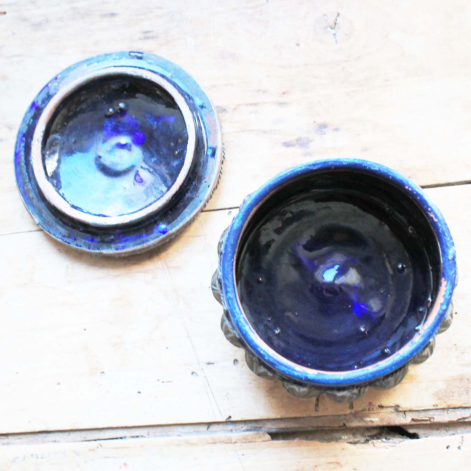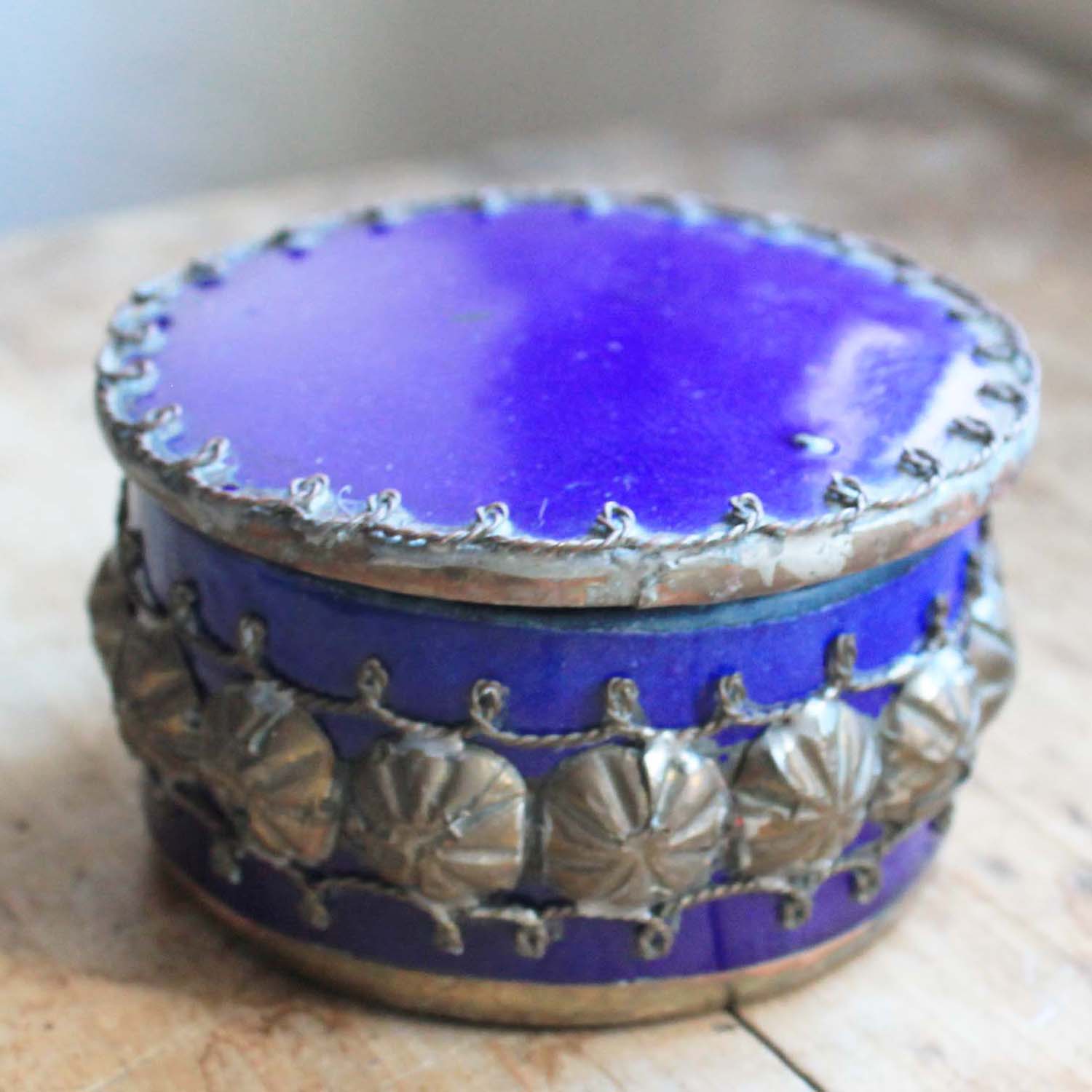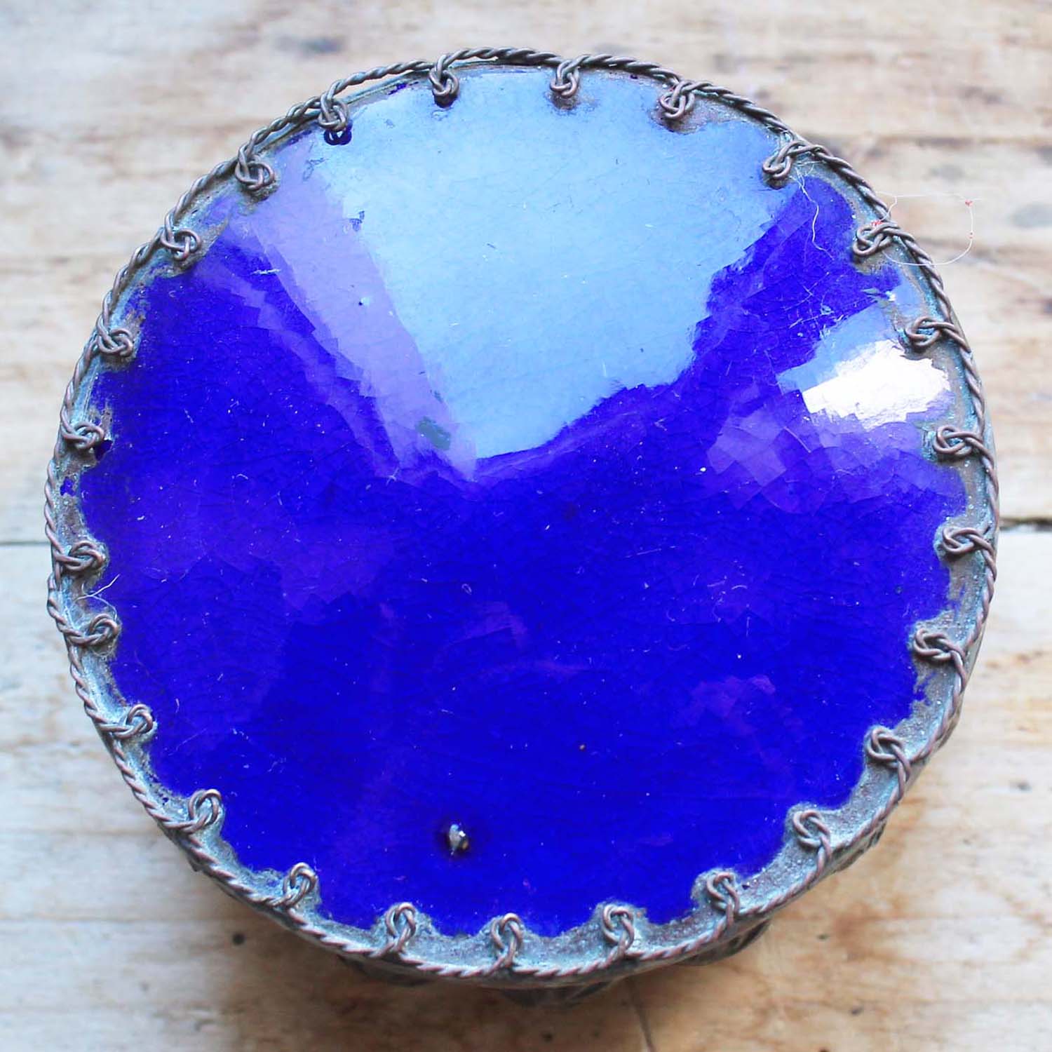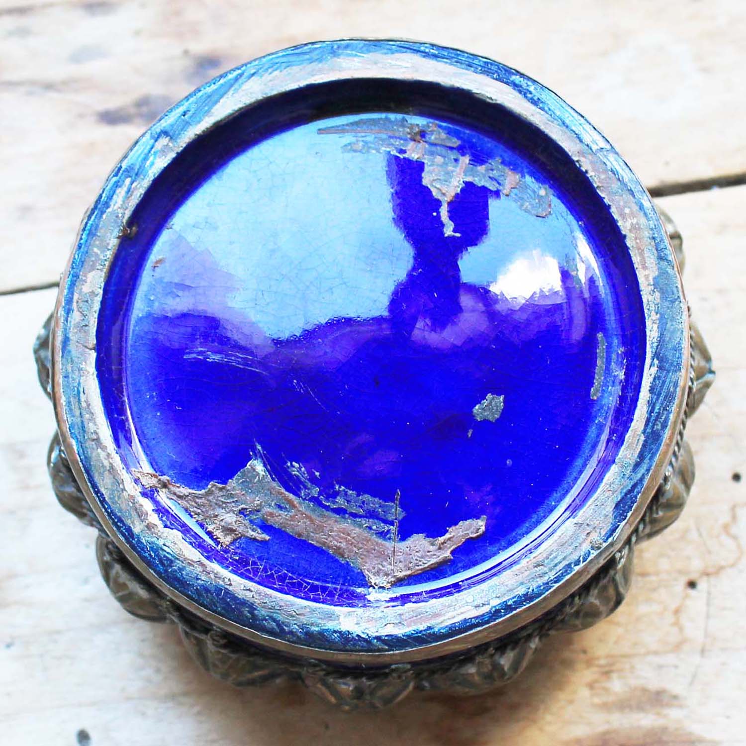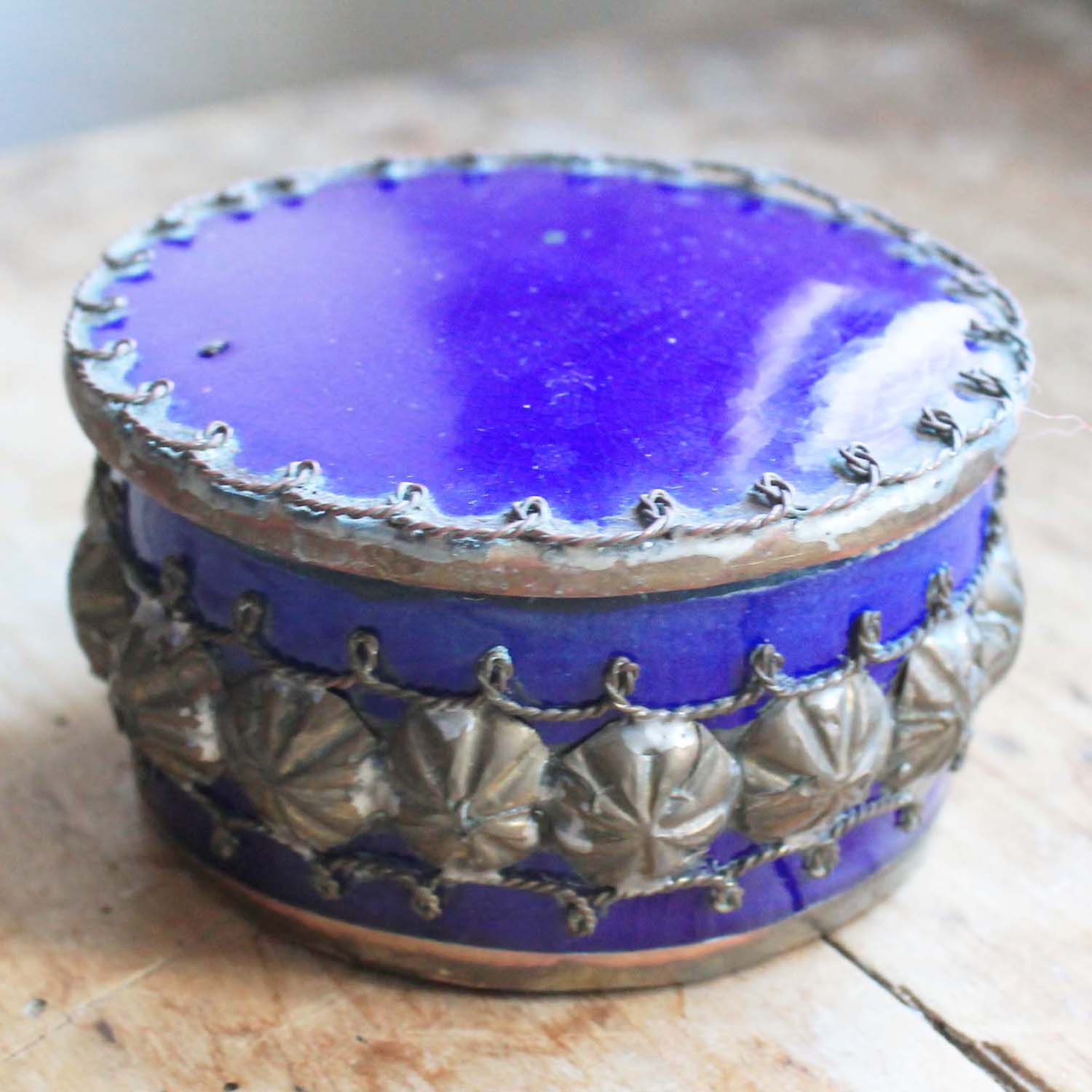 100年近く前の古い容器。陶器製で、金属の飾りがついています。古いものなので傷、汚れがありますが、欠け、ラインはありません。