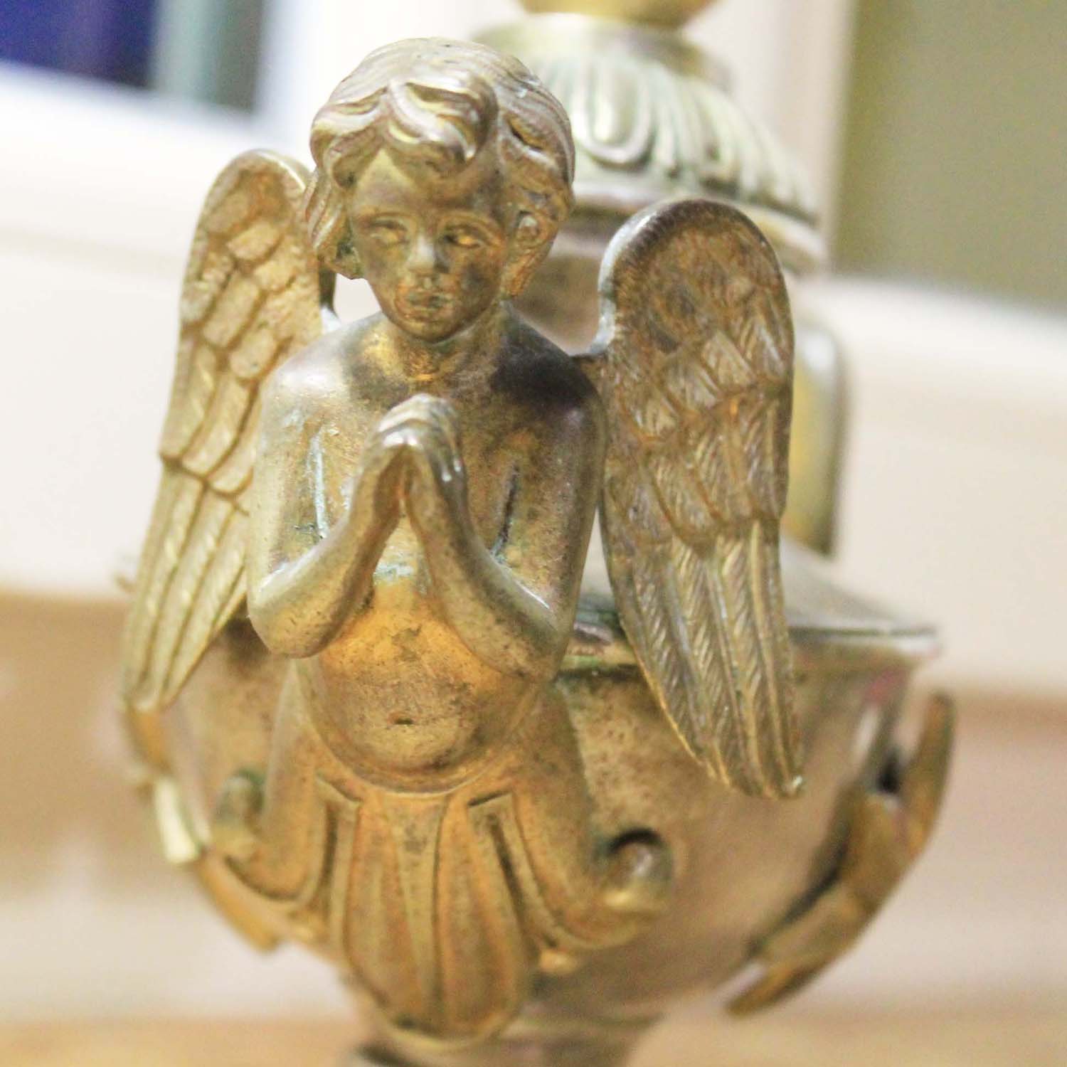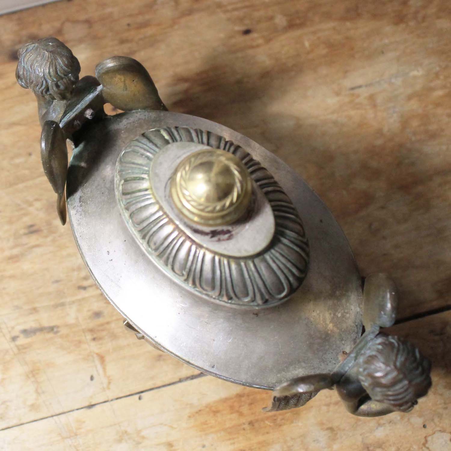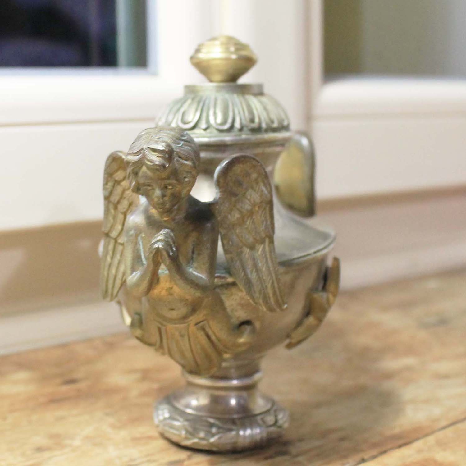 エンジェルが2体ついている古い置物。エンジェル部分は真ちゅう、本体はシルバープレートだと思います。古いものなので多少の傷、汚れ、真鍮部分の変色があります。