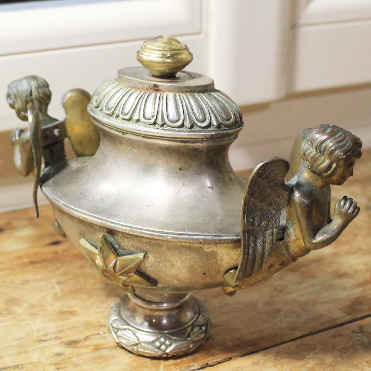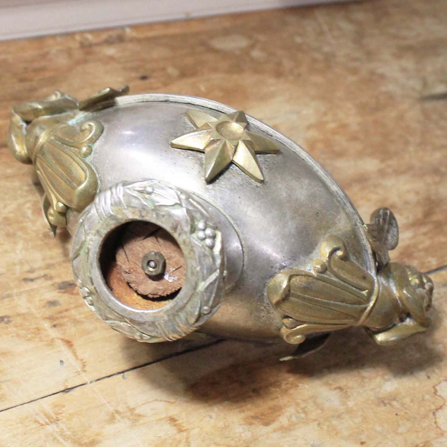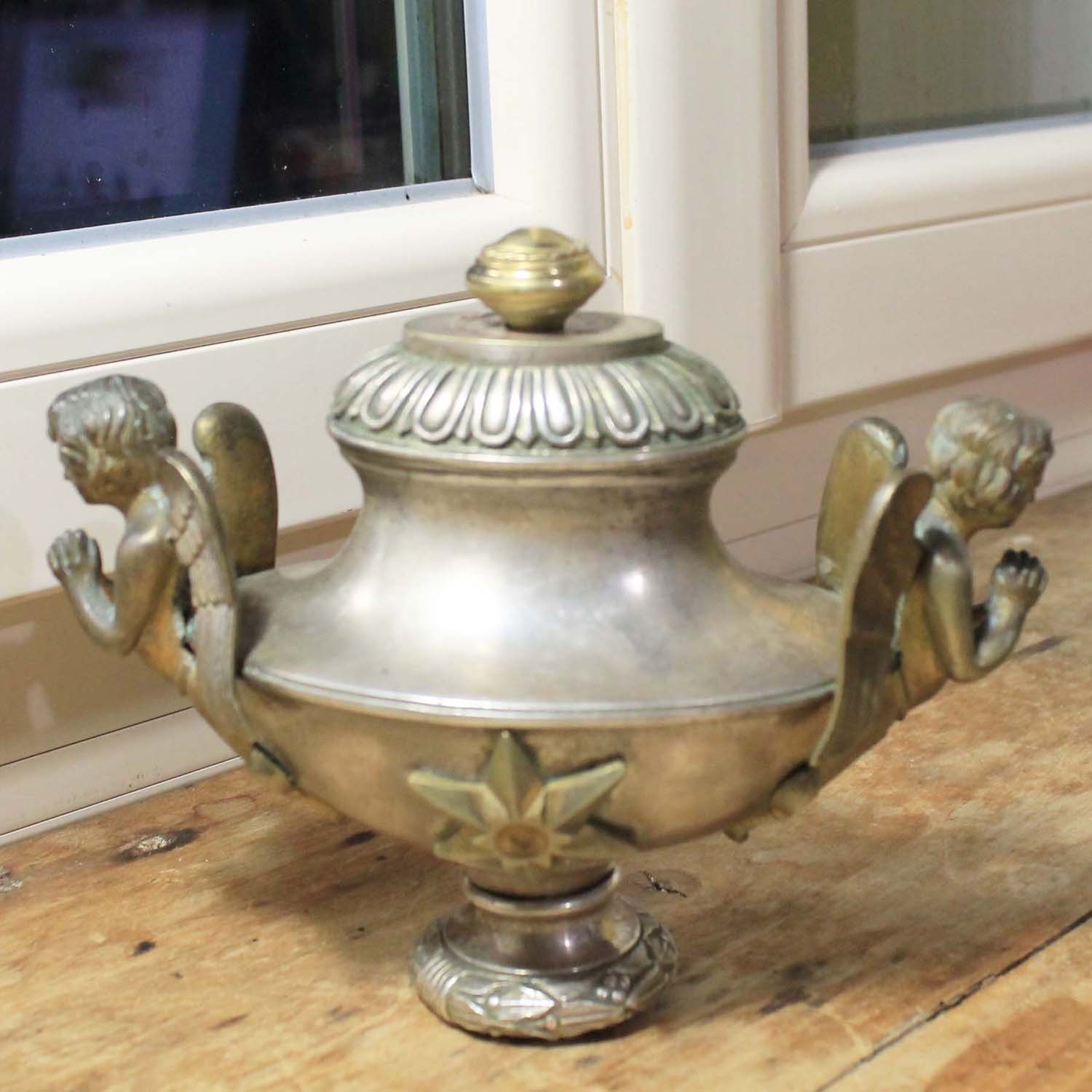 エンジェルが2体ついている古い置物。エンジェル部分は真ちゅう、本体はシルバープレートだと思います。古いものなので多少の傷、汚れ、真鍮部分の変色があります。