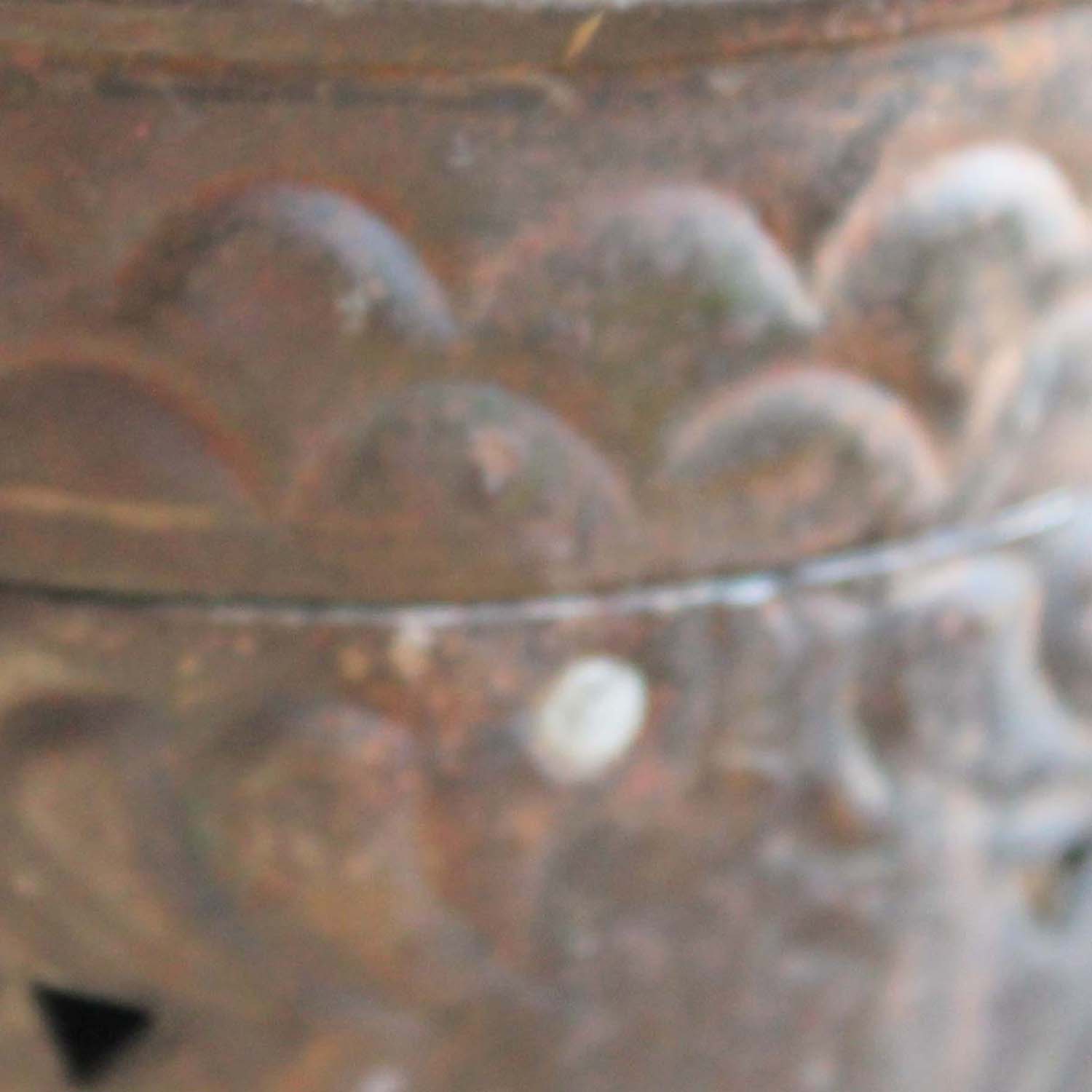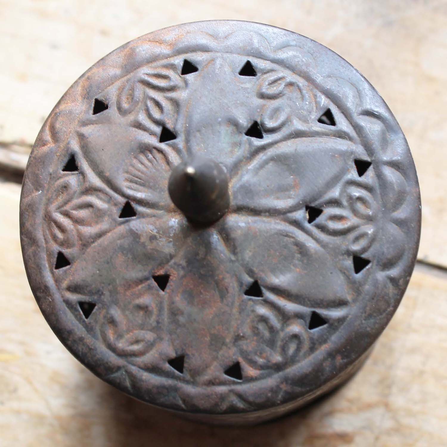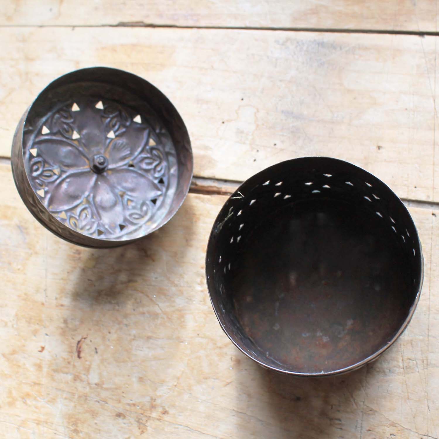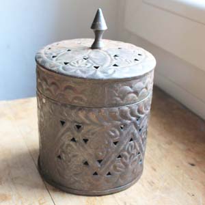 古いブリキ製の容器。 穴が開いているのでポプリなどが入っていたものだと思います。古いものなので多少の傷、汚れがあります。