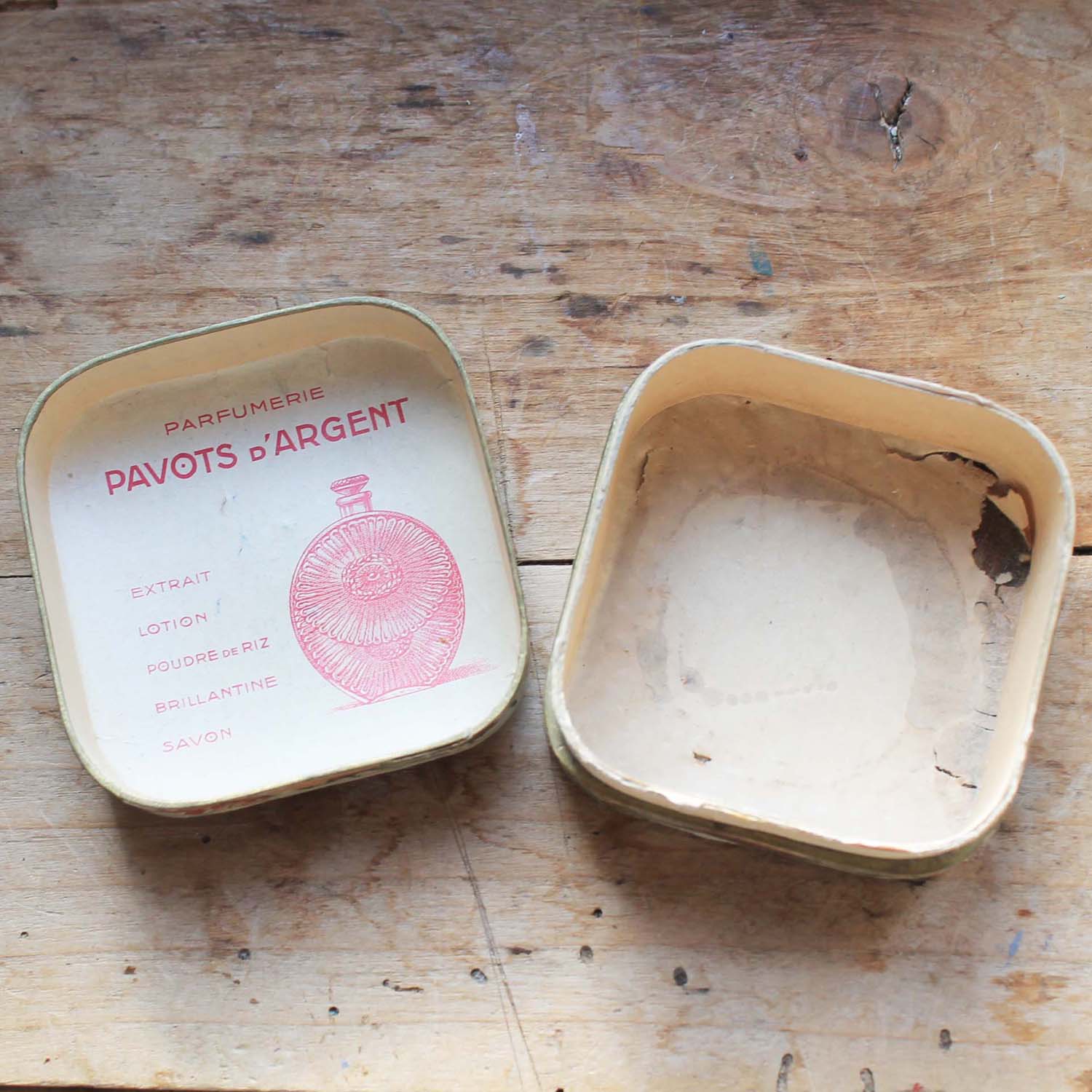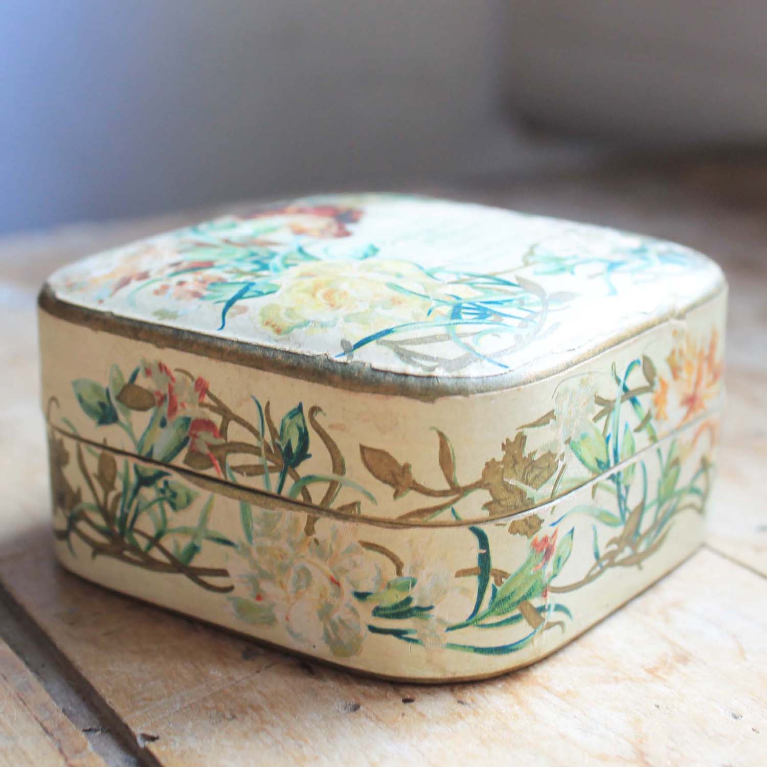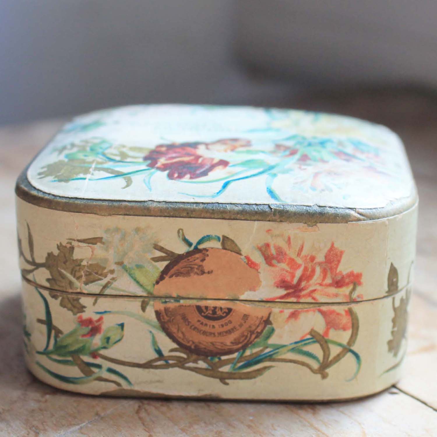 古い石鹸用の紙箱。アールヌーボーのデザインがシックです。古いものなので多少の汚れがあります。