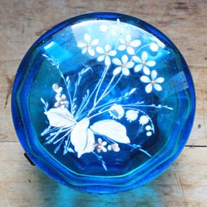 古いハンドペイントの花柄がかわいいガラス製の容器。古いものなので多少の傷、汚れがありますが、欠け、ラインはありません。